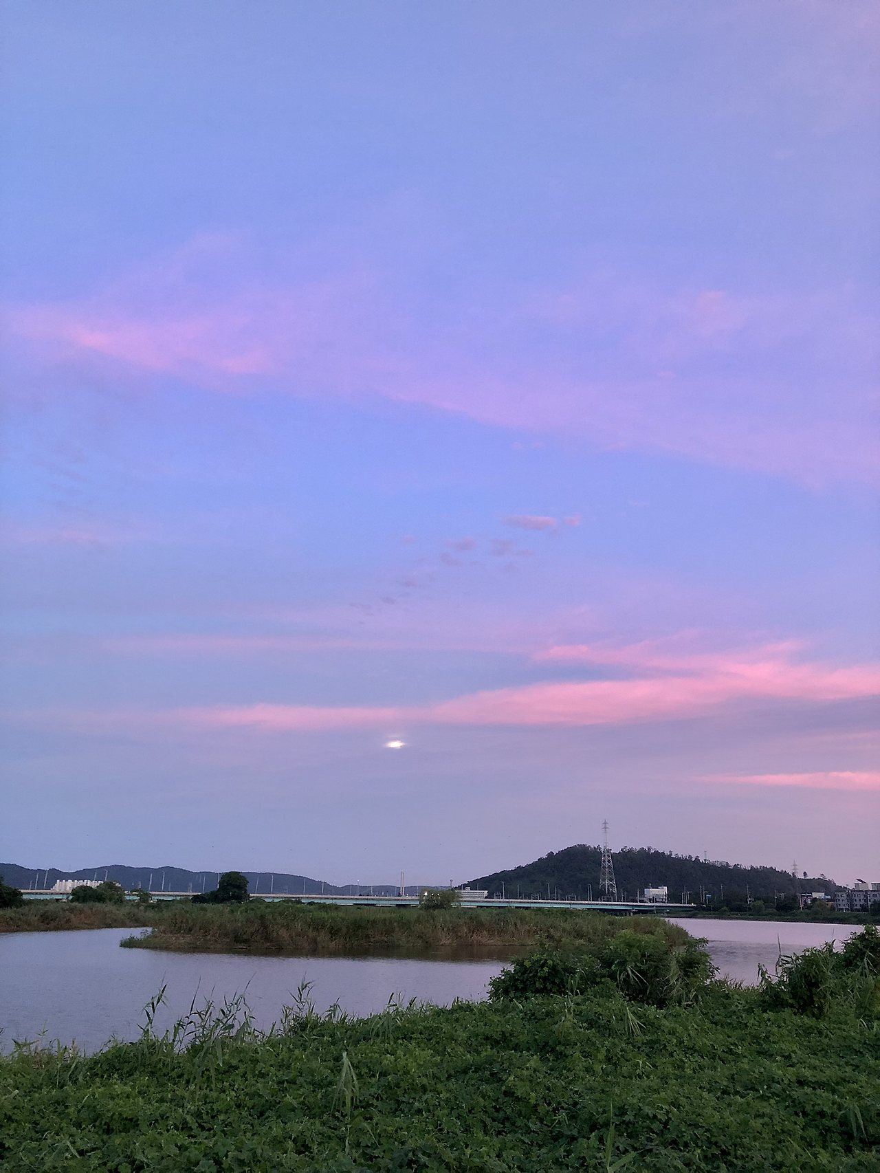 다음 날에도 비슷한 하늘의 색감이다. 그리고 그 사이에 달이 수줍게 얼굴을 내밀고 있다. 늘 생각한다. 이럴 때 좀 좋은 폰카메라였다면. 그러면 달의 모습을 좀 더 달답게 담을 수 있었을 텐데.
