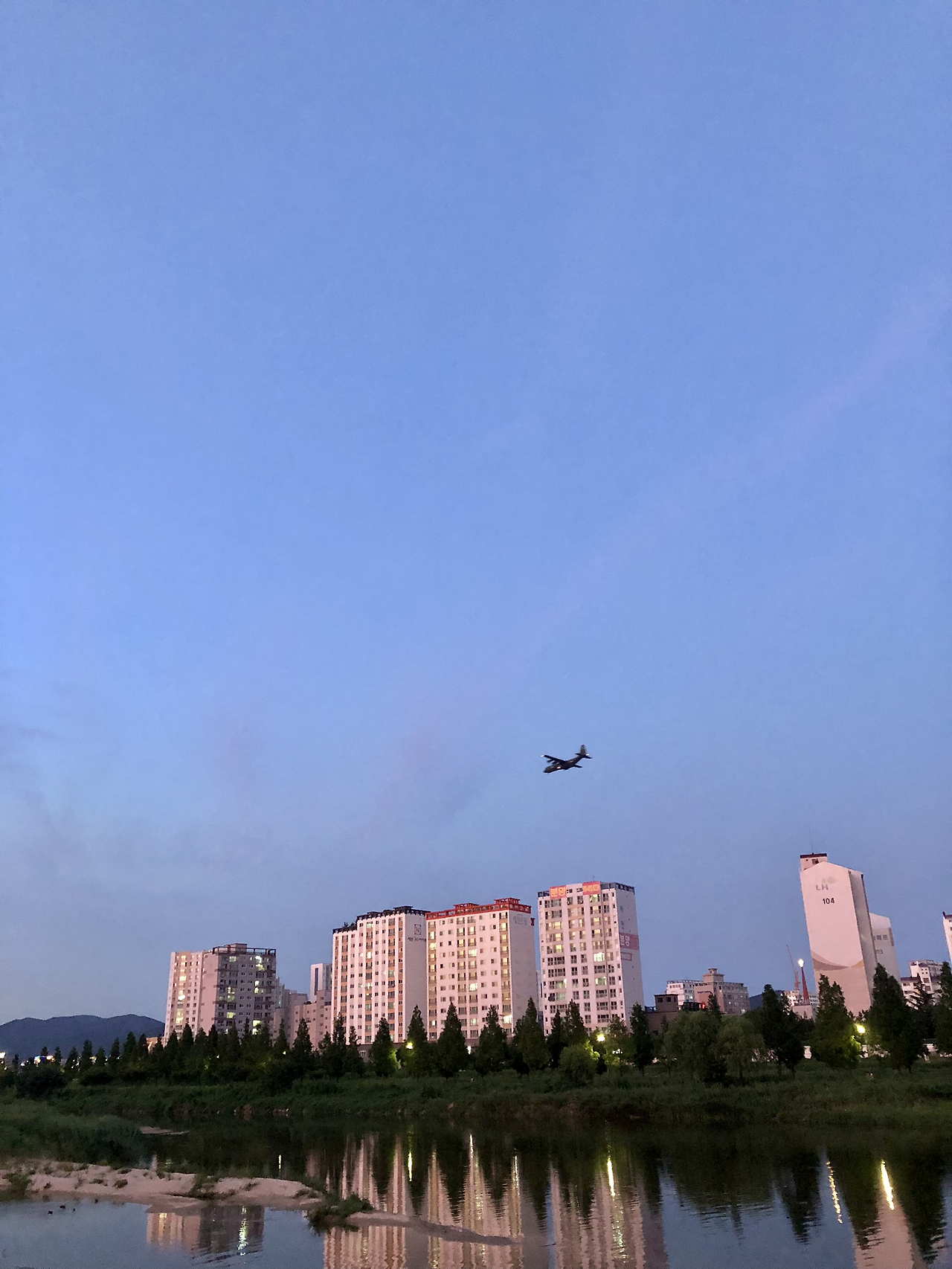 사진에는 저래 보여도 아주 근거리에 떠 있는 장면이다. 저어기 아파트를 지나면 공항이기 때문에 비행기들이 낮게 날아다닌다. 비행기 소리는 때로는 공포다. 특히 전투기 소리는 무섭게 들린다. 그런 소리가 도심지에서 분당 간격으로 들리면 사람들은 두려움에 벌벌 떨 것이다. 소리로 사람을 무섭게 하는 것 중에서는 단연 최고가 아닐까.
