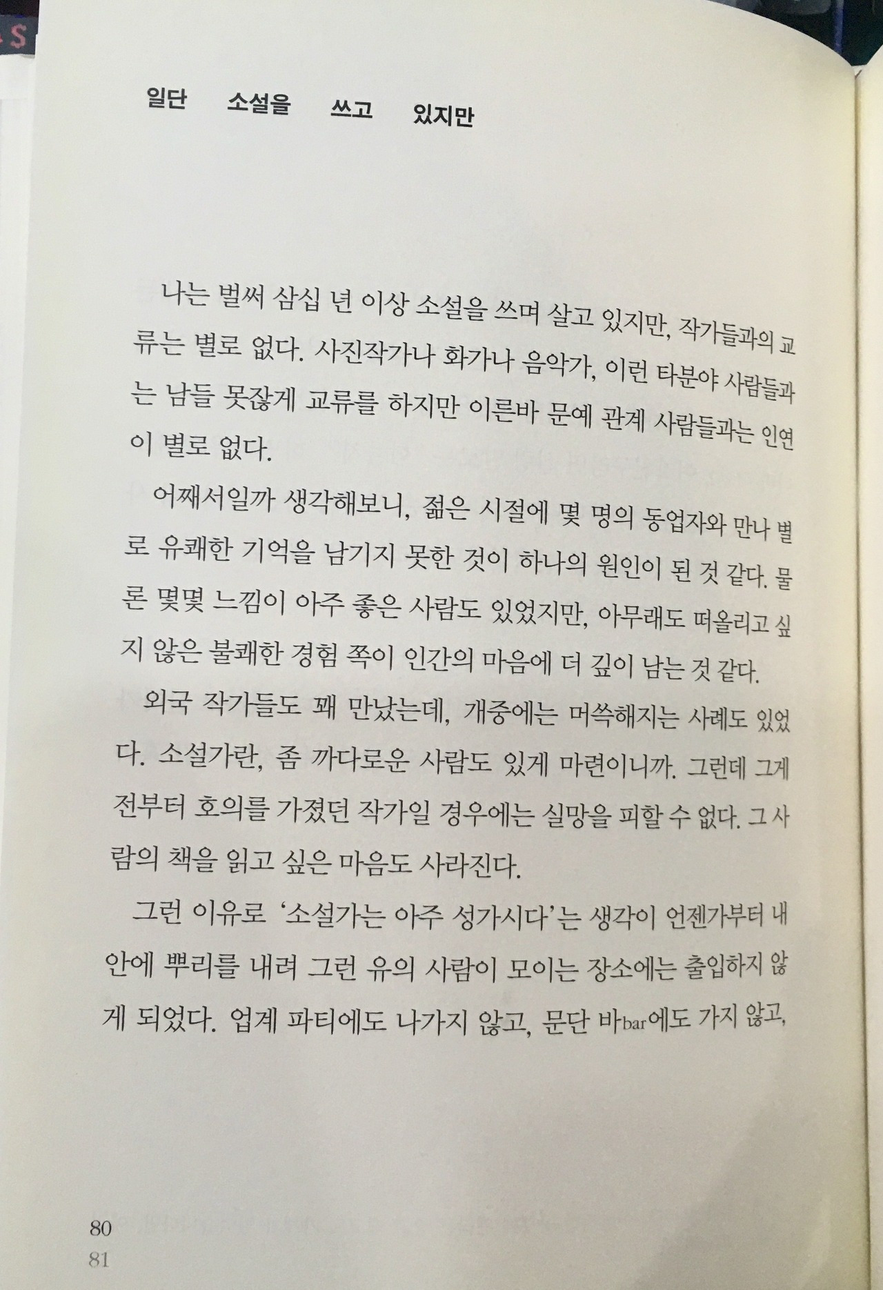 이 에세이의 ‘일단 소설을 쓰고 있지만’의 챕터 내용은 하루키의 넋두리 같은 것이다. 삼십 년 넘게 소설을 쓰고 있지만 작가들과의 교류가 없다던가, 즉 문학에 관련된 작가들과는 교류가 없고, 문단의 모임에도 나가지 않고, 비평가와 그럭저럭 화기애애하게 환담을 나누고 헤어졌는데 하루키를 씹어대는 비평을 했다 던가. 우리가 잘 알고 있는 이야기들이다.