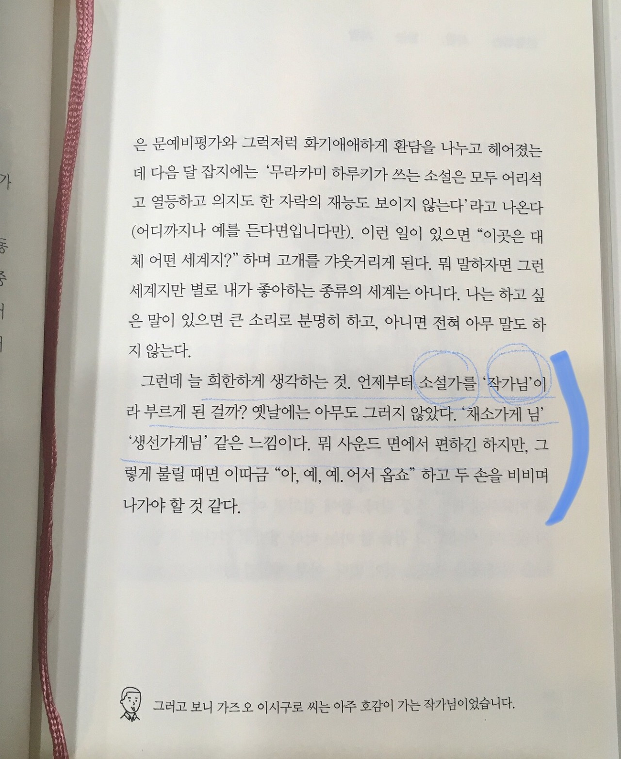 지난번에도 이야기를 했지만 소설가를 언젠가부터 ‘작가님’이라고 부르게 된 걸까? 옛날에는 그러지 않았다고 하루키는 말한다. 예전에 언제였던가 김영하가 자신을 소개할 때 소설가 김영하입니다,라고 하는 것 같았는데. 저는 작가 누구누구입니다, 보다 저는 소설가 누구누구입니다, 가 훨씬 정체성이라든가 더 나아 보이는데.