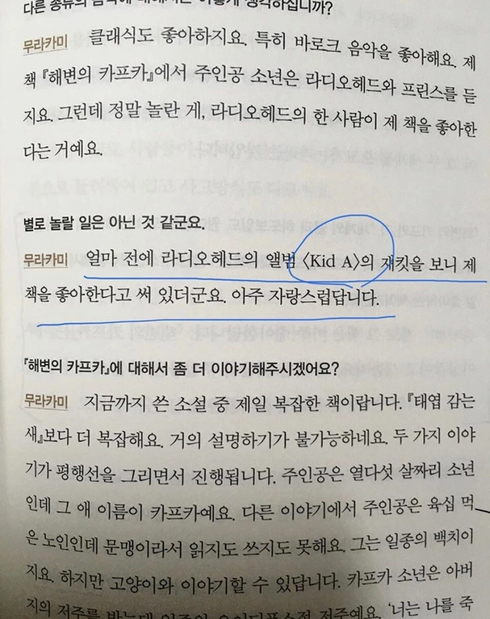 해변의 카프카와 라디오 헤드의 닮은 점이라면 프랑수아 트뤼포의 유연한 호기심에 가득 찬, 구심적이면서도 집요한 정신이 깃들여 있다. 그리고 장 자크 루소의 울타리와 안톤 체호프의 자립적인 개념의 필연성, 헤겔의 자기의식, 앙리 베르그송의 물질과 기억, 헤테로(이형접합자), 티에스 엘리엇이 말하는 공허한 인간들, 소포플레스의 훌륭한 희곡 ‘일렉트라’의 이야기와 아리스토파네스와 괴테가 말하는 세계가 들어있다는 것이다.