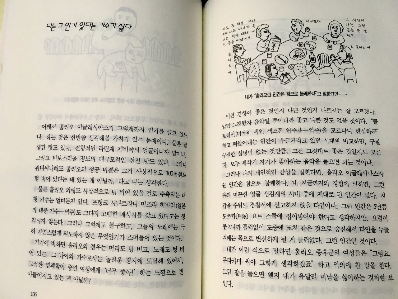홀리오 이글레시아스의 노래는 하루키가 전적으로 별로야,라고 생각하는 음악이다. 이러쿵저러쿵하며 미즈마루 씨에게 홀리오 삽화까지 그려 가면서(미즈마루: 하루키 씨, 정말 괜찮겠어?) 홀리오 이글레시아스의 음악을 돌려까면서 또 다른 면으로 홀리오 씨를 부러워하고 있다.