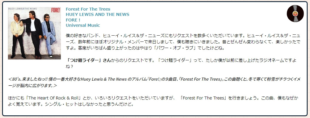 하루키: 제가 좋아하는 밴드 휴이 루이스 앤 더 뉴스의 곡도 신청곡을 많이 받았습니다. 몇 년 전에 거의 오리지널 멤버로 일본에 방문하였는데 저도 노래를 들으러 갔었습니다. 옛날과 전혀 차이가 없어 즐거웠어요. 객석이 가장 고조된 것은 역시 ‘파워 오브 러브’였지만. 외에도 ‘더 하트 오브 락앤롤’등등 여러 노래가 신청곡으로 들어왔지만 ‘포레스트 포 더 트리즈‘로 갑시다. 이 곡, 나도 왠지 잘 기억하고 있습니다.