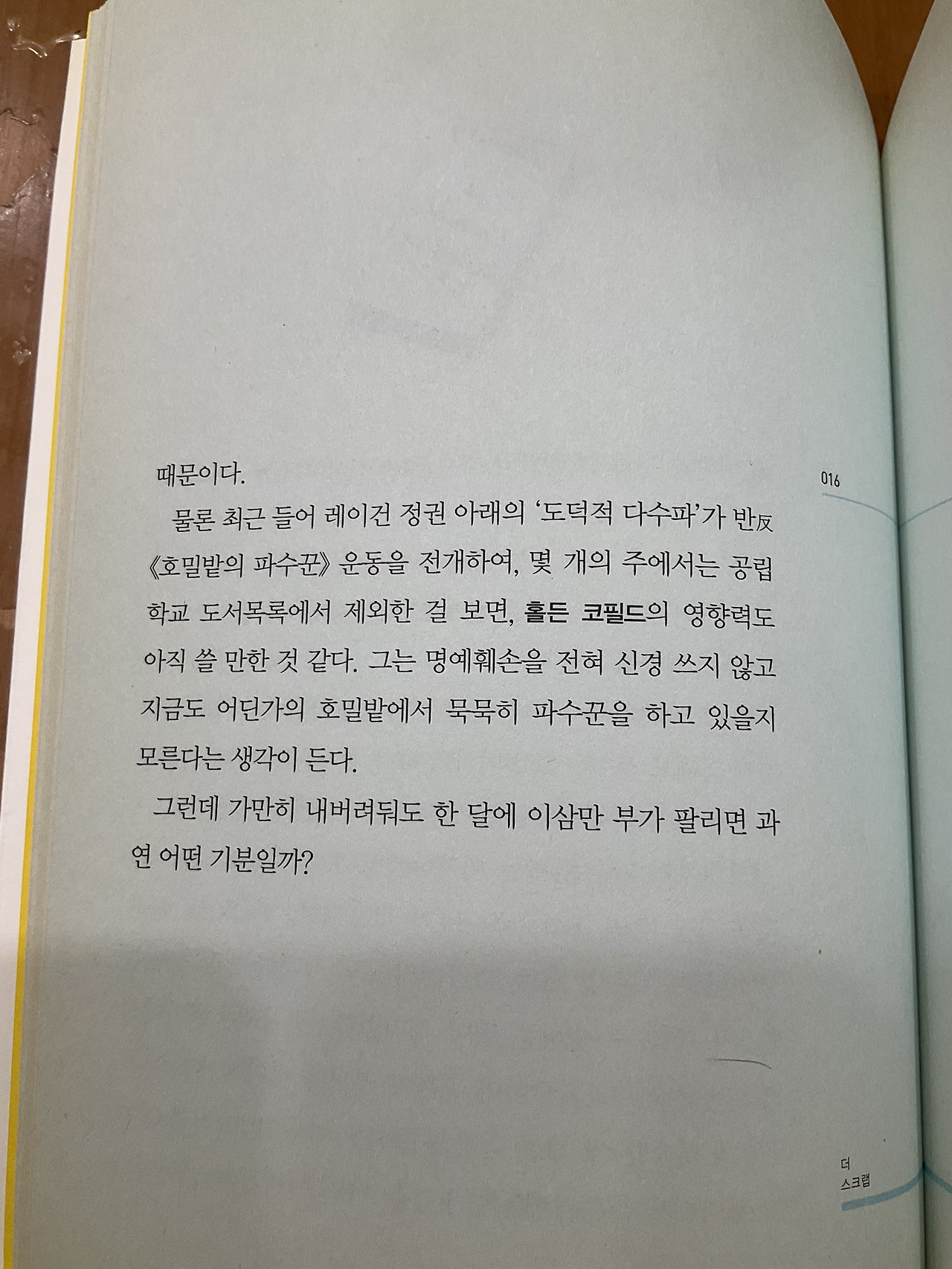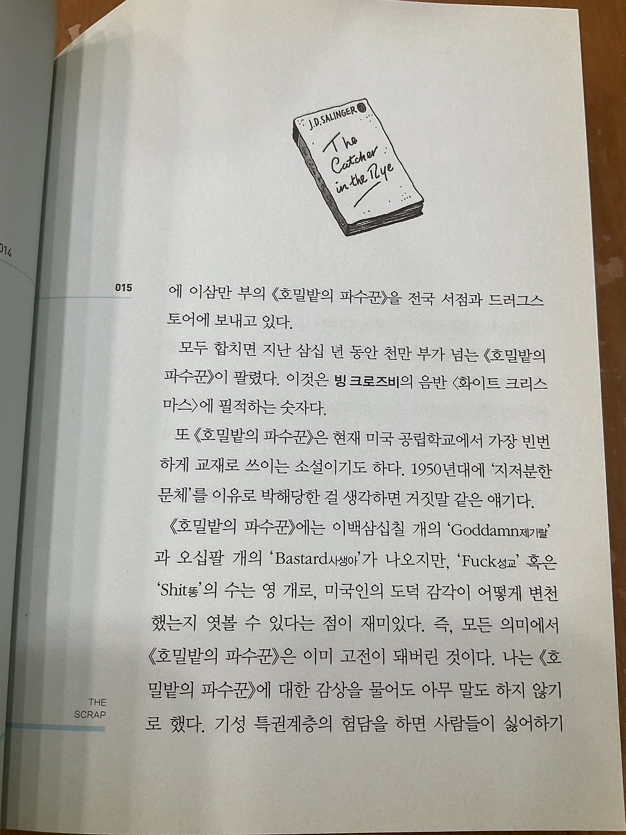 하루키 에세이에도 나오지만 호밀밭 속에는 237개의 갓댐과 58개의 바스타드 내지는 퍽큐 혹은 싯! 이 나온다. 욕이 많이 나온다는 말이지. 미국은 과감하게 이 소설을 공립학교의 교재로 사용했다. 십여 년 전에 미국에 있는 친구에게 들었는데 뉴욕주에 있는 고등학교에서는 존 가드너의 그렌델도 교재로 사용하고 있다고 해서 놀랐다. 나는 그 소설을 너무나 재미있게 읽었는데 소설 속에는 처참한 모습도 많이 나온다.