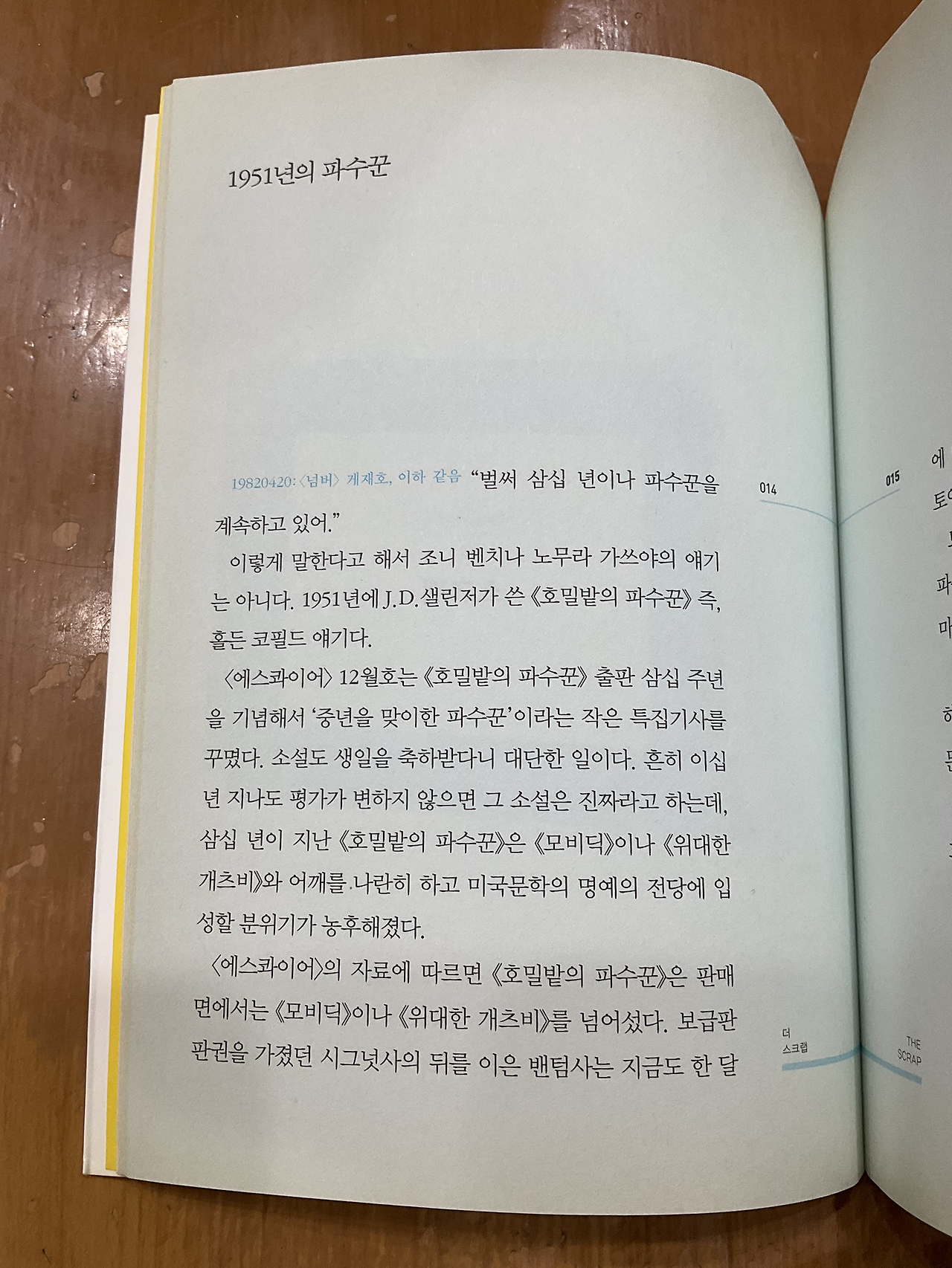 이번 이야기는 셀린저와 그의 수작인 ‘호밀밭의 파수꾼’의 이야기다. 호밀밭의 파수꾼이 ‘모비딕’이나 ‘위대한 개츠비’보다 많이 팔렸다는 이야기도 있다. 이는 빙 크로스비의 화이트 크리스마스 음반과 필적하는 숫자라 한다. 하루키는 샐린저도 좋아하지만, 위대한 개츠비를 세 번 읽은 사람과는 친구가 되어도 좋다고 할 정도로 피츠 제럴드를 좋아한다.