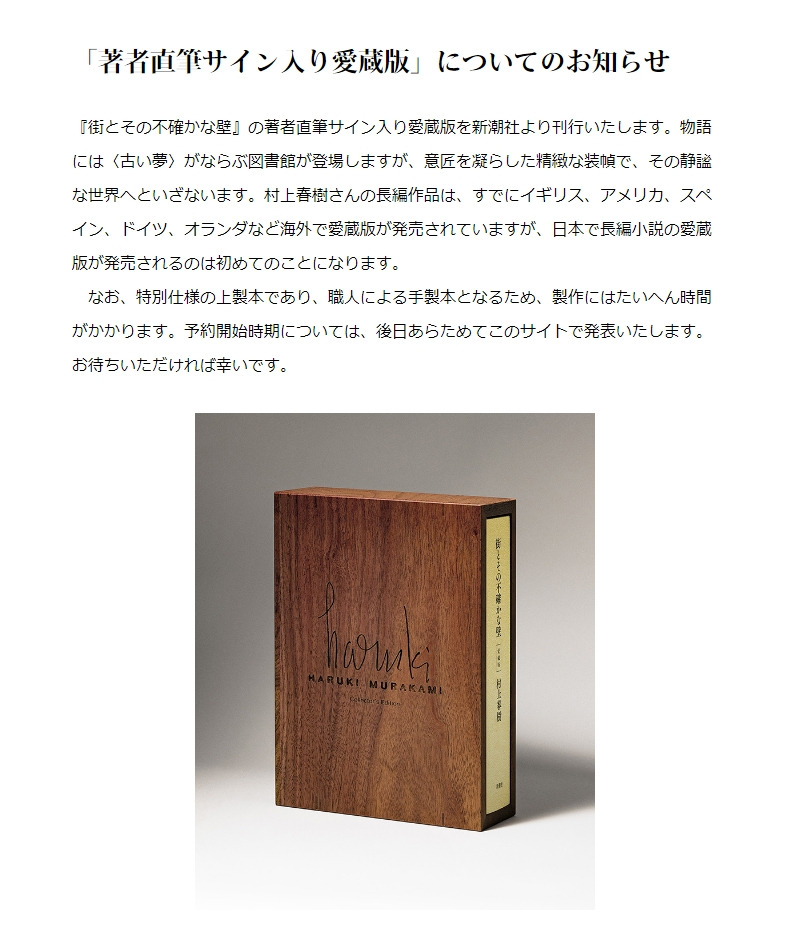 하루키의 신작 거리와 그 불확실한 벽의 목각 애장판을 딱 300부만 제작해서 판매한다는 소식이 있었는데 이미 다 팔렸겠지요.