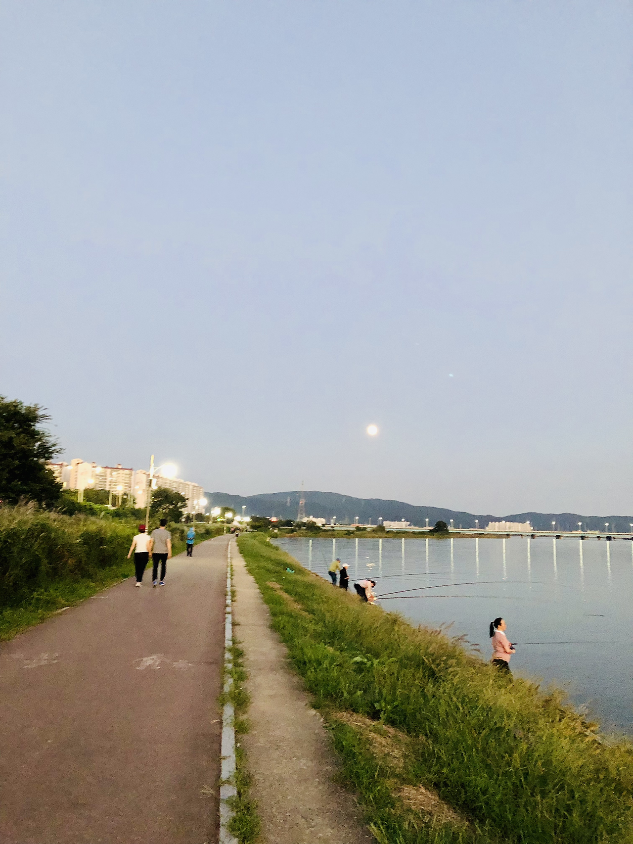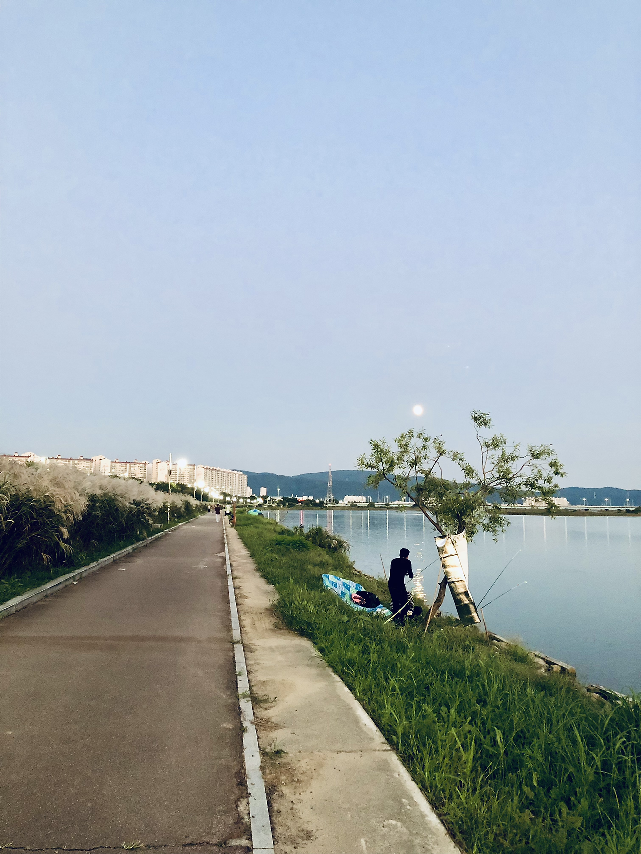 추석명절에는 언제나 이렇게 고요하고 평온한 풍경이 펼쳐진다. 도시에서 강 하류에 낚시를 하게끔 낚시터를 마련해 놨다. 저기 다리를 지나면 바다가 나온다. 그 바다에서 자동차를 실어서 해외로 나간다. 바다와 강이 만나는 지점이라 물고기들이 많이 있다.