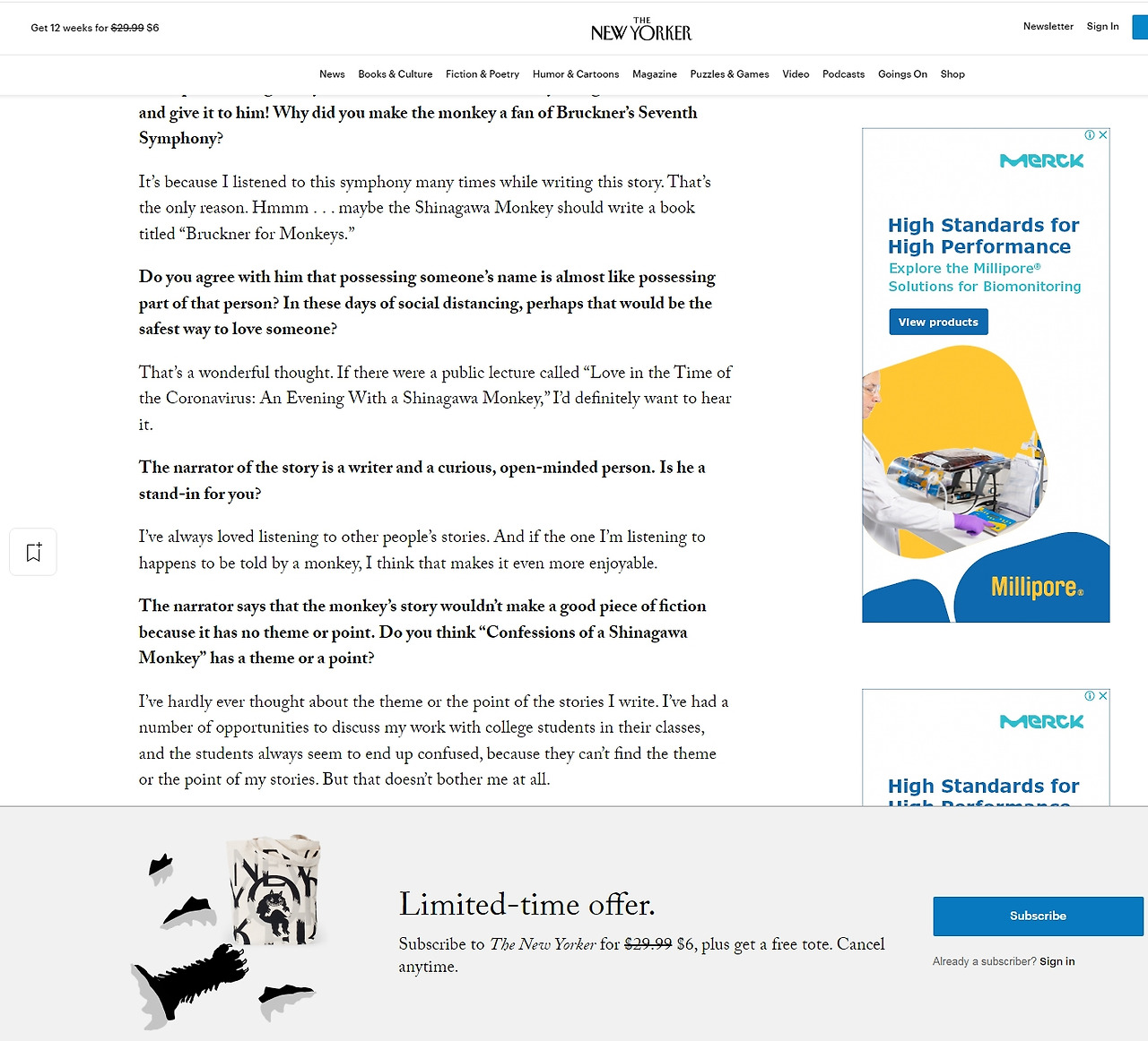 원숭이의 이야기가 주제가 없다는 질문에, 제가 쓴 이야기들의 주제에 대해 생각해 본 적이 거의 없습니다. 대학 강의 시간에 학생들과 제 작품에 대해 토론을 하는데 학생들은 항상 제 작품의 주제를 찾을 수 없어서 혼란스러워했던 기억이 있습니다. 하지만 그런 점들이 사람들을 불편하게 하거나 신경 쓰이게 하지는 않는 답니다.]