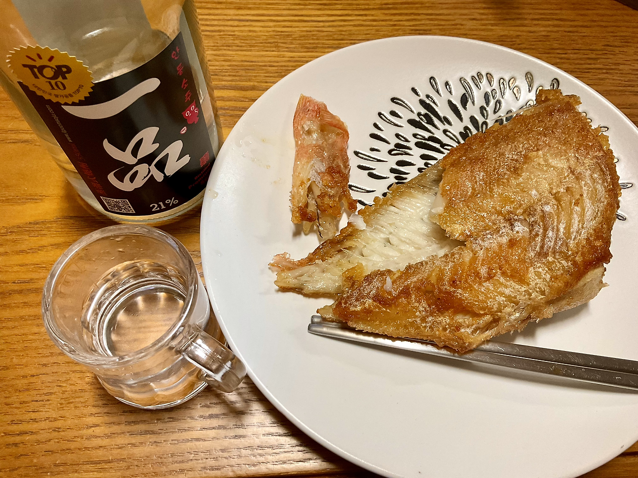 안동소주는 저렇게 소주병보다 작은 병인데 거의 칠천 원 정도 한다. 안동소주는 독한데 그 맛이 좋다. 사실 소주보다 훨씬 좋다. 이렇게 기름에 두른 생선구이를 먹을 때 독한 술이 꼴까닥 목으로 넘어가면 목이 화악 씻기는 느낌이다.