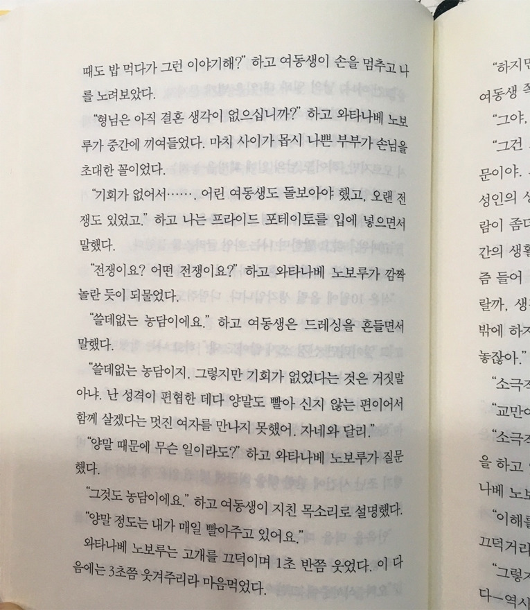 그러면서 하루키씩 유머가 가득하다. 휴지는 좀 제대로 처리하라느니, 위 사진 속 책에 있는 농담이 가득하다. 늘 내 곁에 작은 아이로 존재했던 동생이 어느새 결혼 나이가 되어 버려 떠나가는 것을 바라보는 마음을 이렇게 아무렇지 않게 잘 썼다는 게 흥미롭고 신기하다.