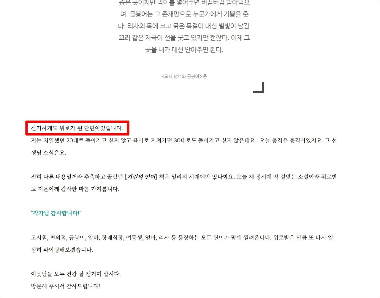 그리고 리뷰를 해 준 분은 나에게 감사하고 인사까지 남겼다. 나야말로 감사한 일이다. 나는 매일 글을 적고 있지만 주위에서 가끔씩 듣는 말이 너의 글이 누군가에게 힘이 되는 그런 힘이 있는 글을 써라는 말이다. 하지만 나는 누구를 위해서 글을 써본 적이 없다. 좀 이기적일지는 몰라도 나는 나를 위로하기 위해서 글을 쓸 뿐이다. 누군가를 위로하는 글은 서점에 엄청 많이 있다. 굳이 나까지 누군가를 위로하기 위해서 글을 쓸 필요는 없고 그럴 자신도 없다. 리뷰를 해 준 분이 나의 글에게 위로를 받았다면 아마 나와 비슷한 마음이지 않았을까 싶다.