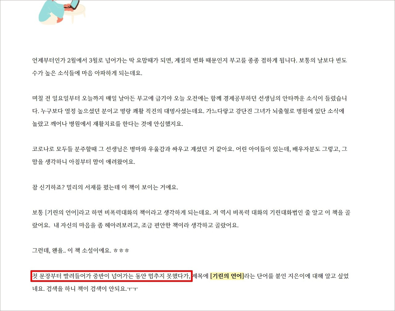 누군가 밀리의 서재에 있는 나의 단편 소설을 리뷰해 주었다. 이렇게 정성 가득한 리뷰를 보게 되다니. 기분이 좋다. 특히 위로가 되었다니, 그리고 받은 위로를 연료 삼아 열심히 파이팅 하겠다고도 했다. 아마 그분의 리뷰를 보니 아주 힘들 때 나의 단편 소설을 읽게 된 모양이다. 그리고 그 안의 이야기에, 주인공들에게 위로를 받은 모양이다. 이 소설은 사실 내가 힘들 때 나를 위로하기 위해 썼던 소설이다. 처음에는 아주 긴 소설이었고 주인공들이 다 죽는 결말이었는데 행복하게 끝나도 괜찮잖아, 하면서 대거 줄이고 줄여 읽기 쉬운 짤막한 이야기가 되었고 주인공들은 행복하게 될 거라는 결말로 끝난다. 내가 쓰면서도 주인공들에게 힘을 내,라고 하면서 동시에 나도 힘을 받게 되었다.