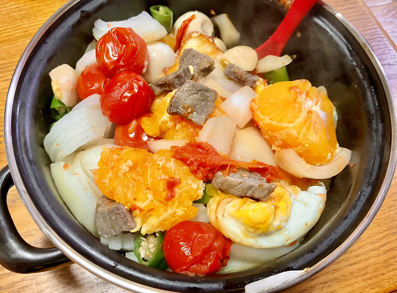 그래, 라면에 넣어서 먹는 귤이 맛있다면 볶음에도 귤을 넣어보자. 그래서 정체불명의 요리지만 뭔가 잔뜩 넣고 달달달 볶을 때 역시 귤을 넣어서 볶았다. 역시 뜨거워진 귤은 맛있었다.