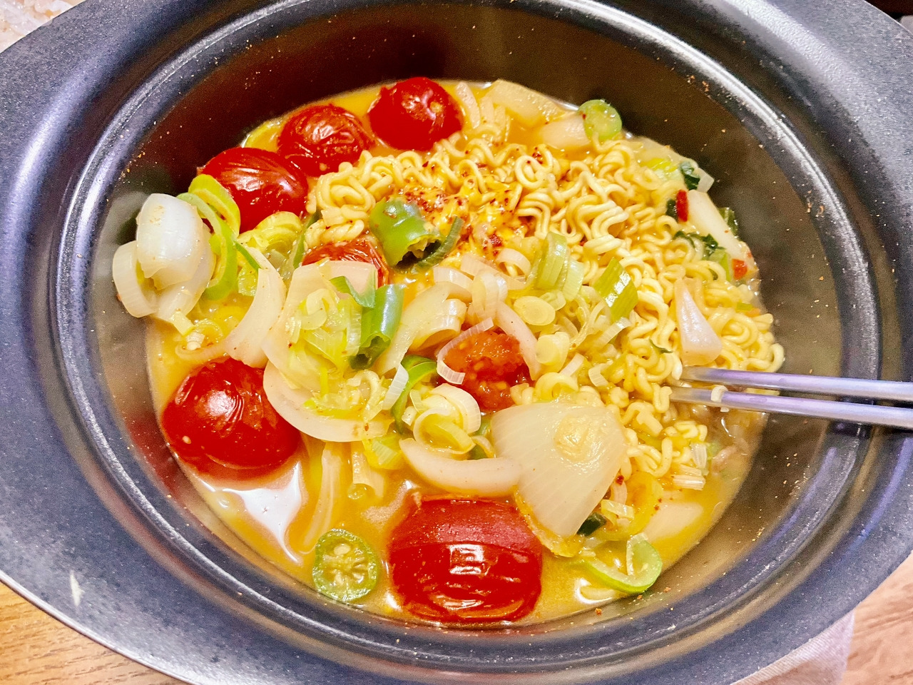 토마토를 뜨겁게 먹기 위해서 가장 쉬운 방법은 라면에 풍덩풍덩 빠트려서 먹는 것이다. 라면에 빠진 토마토는 역시 맛있다. 이렇게 모양 그대로도 맛있지만 익은 토마토를 터트려 토마토의 신 맛이 라면국물에 스며들게 해서 먹어도 좋다.