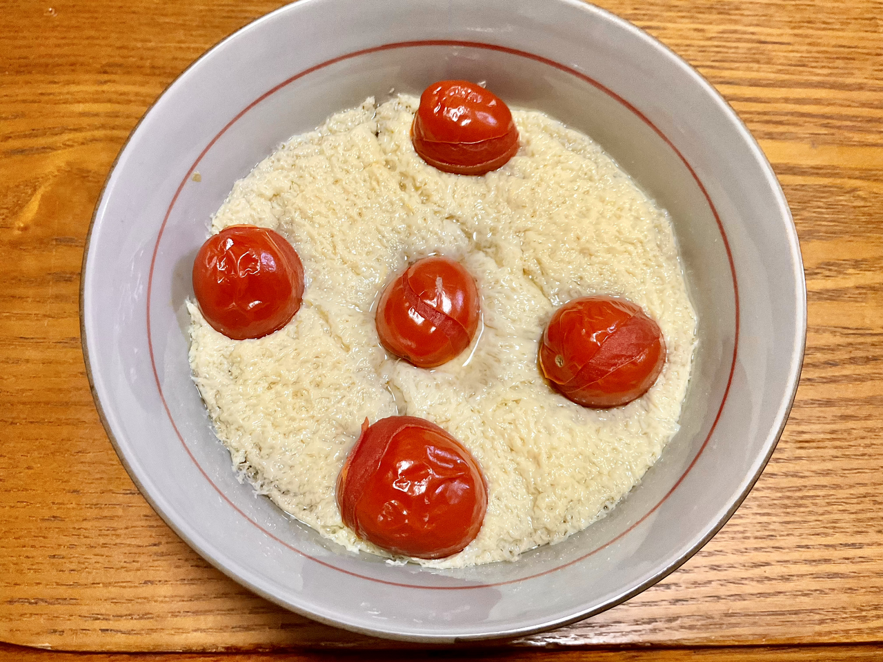 계란을 휘휘 저어서 물을 붓고 소금을 조금 넣고 찔 때 토마토도 같이 넣어서 쪘다. 계란찜에 빠진 토마토 역시 맛있다. 봐봐 보기에도 좋잖아. 노란색과 붉은색의 조화가 그릇의 컬러와도 어울린다. 계란찜에 들어간 토마토를 숟가락으로 푹 떠먹으면 행복하다.