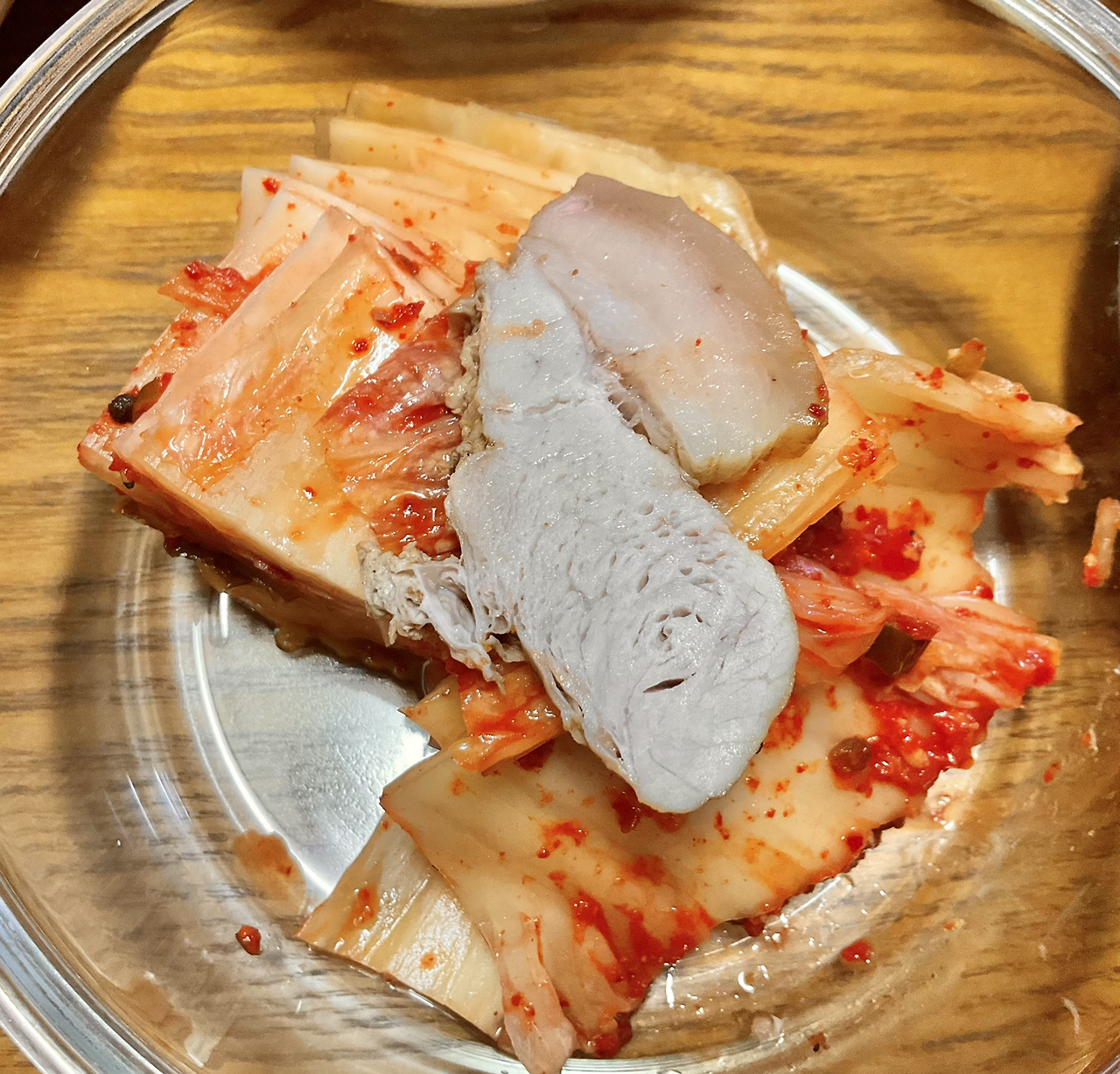 김치를 그렇게 잘 먹지 않지만 나도 이렇게 잘 익은 김치는 맛있게 먹는다. 갓 지은, 아주 뜨거운 밥에 올려 먹으면 아삭아삭 식감과 함께 톡 쏘는 신 맛이 터진다. 삶은 고기도 그렇게 맛있는 부위가 아니라도 상관없다. 김치가 맛있기 때문에 밥이나 고기는 그냥저냥이라도 괜찮다. 고기와 김치의 역할이 바뀌는 것이다. 김치가 주인공이 된다. 그런 자세로 김치를 대한다. 어딘가에 곁들여서 주 요리의 맛을 끌어올리는 반찬이 아니라 당당하게 주연으로 대하는 자세로 먹으면 더 맛있는 것 같다.