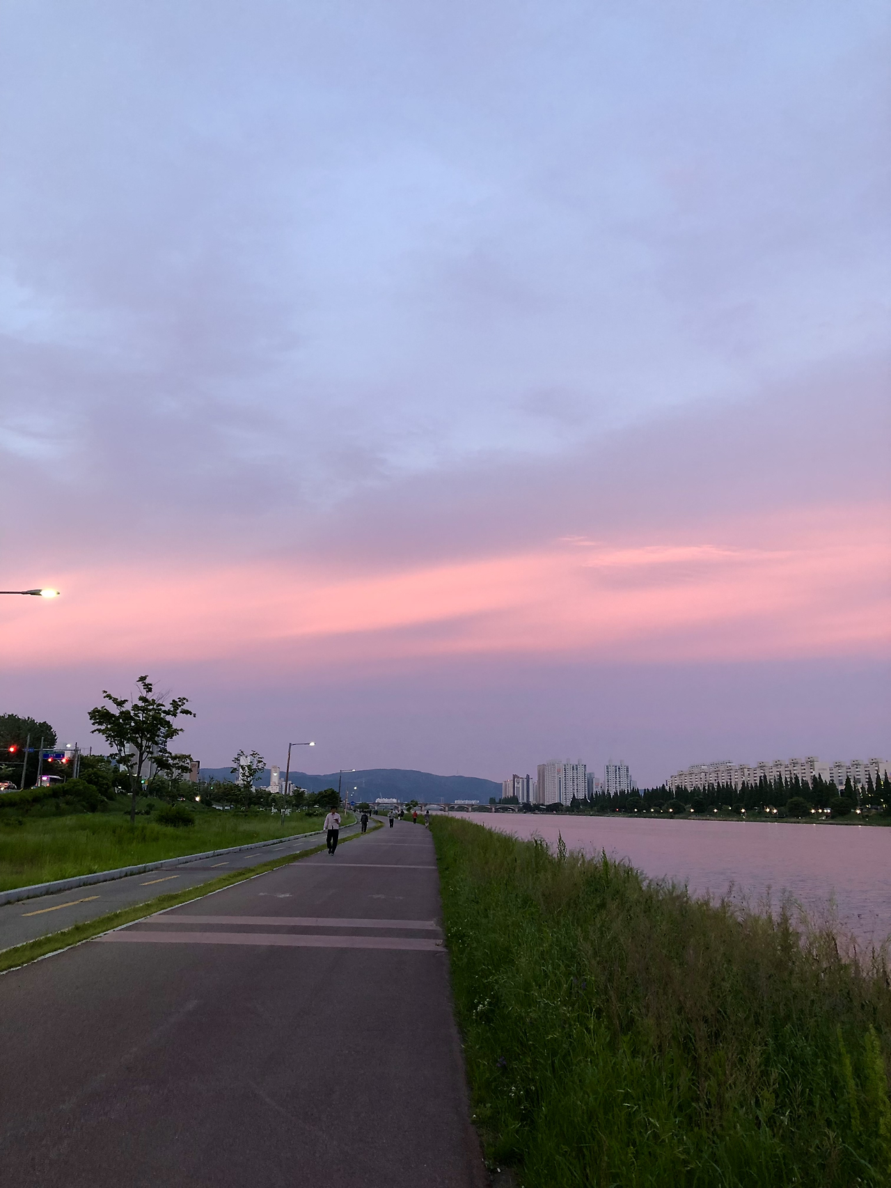 비가 많이 오는 가운데 사이사이에 맑은 날이 있었다. 어떤 날의 저녁은 구름이 층위를 나타나며 어둡기 전에 푸른 하늘이 펼쳐지더니 어느 날 저녁은 동쪽 하늘인데 노을과 비슷한 색감을 드러냈다. 참 신비한 컬러였다. 일 년 중에 한 번은 이런 색감의 하늘을 본다. 자주 볼 수는 없다. 하루나 이틀 정도 볼 수 있다. 365일 중에 한두 번 볼 수 있는 이런 하늘의 색감을 바라보고 사진을 한 컷 찍는다. 저녁 7시가 넘은 시간이기 때문에 찰나로 어두워지고 러브 크래프트의 소설에서나 나올법한 묘한 색감은 사라지고 만다.