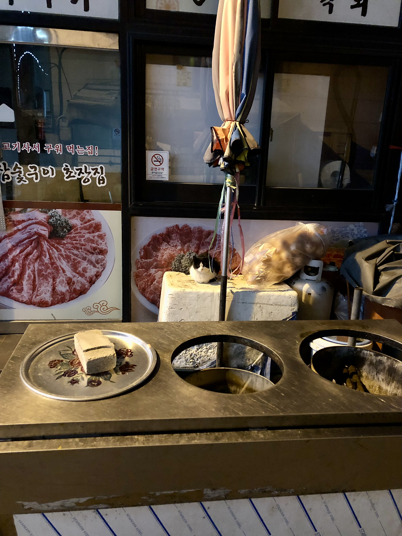 반환점을 돌아서 올 때가 되어서야 나는 술렁술렁 걸으며 살살 뛰어서 온다. 오는 도중에는 전통시장을 지나서 온다. 예전과는 다르게 저녁 8시가 되면 거의 대부분 철수를 한다. 문을 닫은 한 식당에서 고양이 한 마리를 봤다. 이 녀석은 늘 이 식당에서 떨어지는 콩고물을 받아먹는 녀석이다. 항상 식당 문 앞에서 손님들이 먹고 남은 걸 던져주나 하며 기다리고 있다. 오늘은 일찍 문을 닫았는지 저기에 올라가서 지나가는 나를 구경하고 있다. 불러도 무시한다. 개 무시.