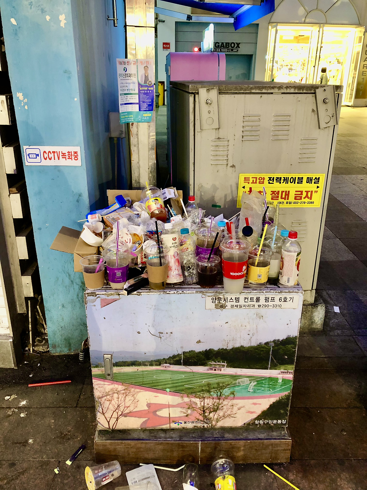 그리고 다운타운 안으로 돌아오는데 사람들이 스트리트 예술을 전시하고 있었다. 모두가 한 마음이 되어 공간 예술을 하고 있었다. 개개인의 취향을 알 수 있는 작품이다. 어떤 놈은 편의점에서 파는 음료를, 어떤 새끼는 로컬 카페에서 음료를 마시고 예술 작품을 만들었다. 액체 같은 음료나 물이 들어가면 안 될 것 같은 특고압 전력케이블이 매설되었다는 표기에도 불구하고 사람들은 목숨을 걸면서까지 작품 활동에 모두가 한 마음이었다. 시시티브이가 녹화를 하고 있는 모양인데 작품 활동한 사람들 중에 한 사람에게 금융치료라고 할 수 있는 선물을 줄 수 있는 역할을 할 수 있으면 좋겠다. 선물을 받는 사람은 얼마나 놀랄까. 당신은 예술 작품 활동을 가장 멋지게 하였기에 선물을 드립니다. 이 작품의 제목은 무엇일까.