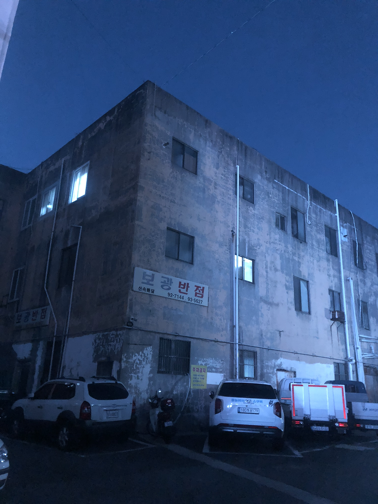 이곳은 아파트 단지 안이다. 한 40년 된 아파트 단지인데 아파트는 한 동이며 엘베가 없는 아파트고 단지 안에 이런 건물도 있다. 이곳을 지나치면 한 5초 동안 서서 여기서 단편 공포영화를 찍으면 참 좋겠는데, 같은 생각을 한다.