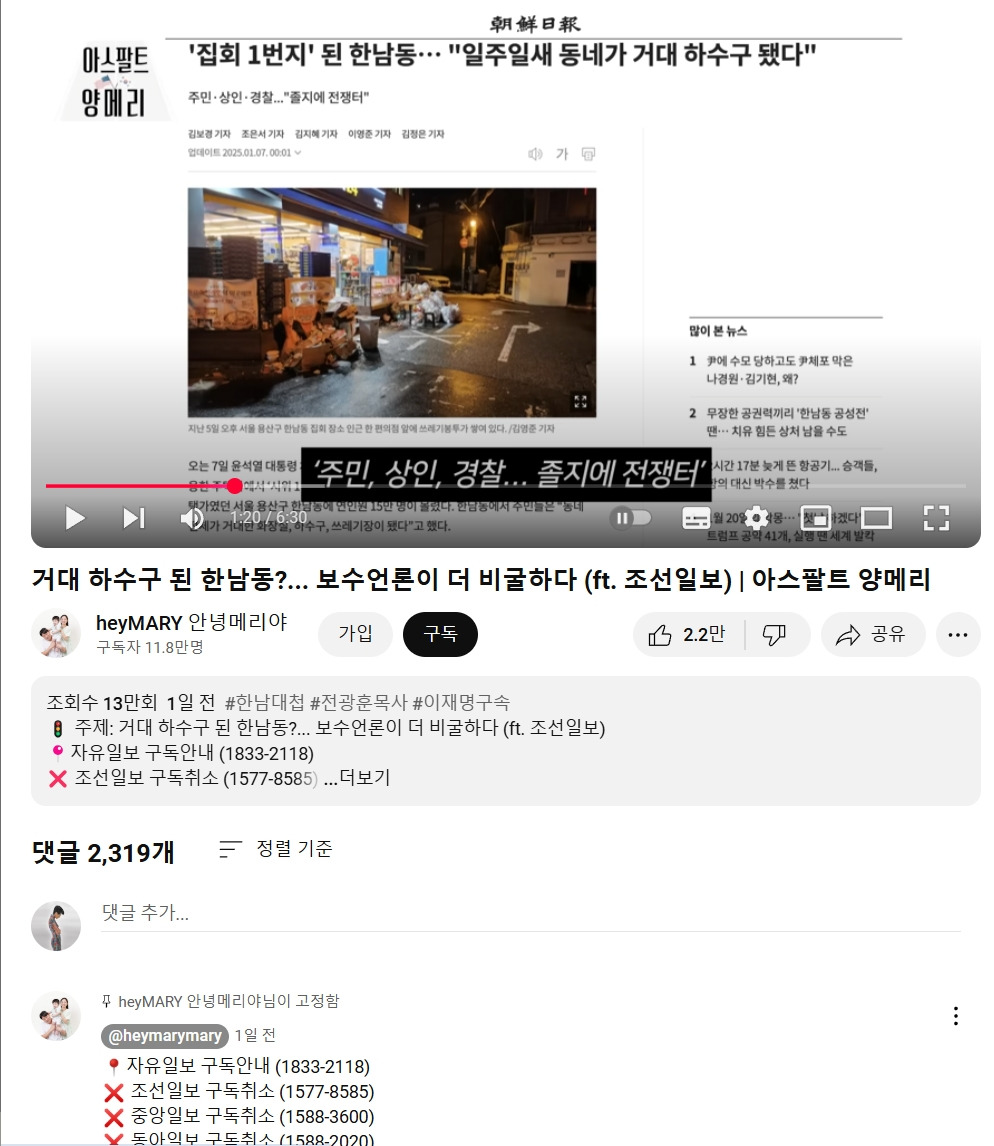 한 달 동안 우파 유튜브를 보면서 재미있는 현상을 하나 발견했는데 우파는 현재 언론이 전부 좌파가 되었다고 편향된 기사만 내보낸다고 분노하고 있다. 네이버나 다음의 언론 기사를 아무리 봐도 우 쪽으로 기울어져 있는데 우파에서 보는 언론은 심하게 좌파로 보이는 모양이었다. 한 우파 유튜브는 신남성연대 대표와 함께 집회 후 쓰레기 문제로 조선일보를 좌파라고 욕을 하는 방송을 하더라. 그 부분이 신기하기도 하고 놀랍기도 했다. 조선일보는 지금까지 좌로 기운 적이 없는 언론으로 이번 계엄 사건 이후 보수언론 대부분이 윤에게서 돌아선 칼럼을 쏟아냈지만, 조선일보는 끝까지 윤을 감싸고돌았는데도 우파 유튜버들에게는 조선일보도 좌 편향 언론으로 전락했다고 욕을 듣고 있었다.