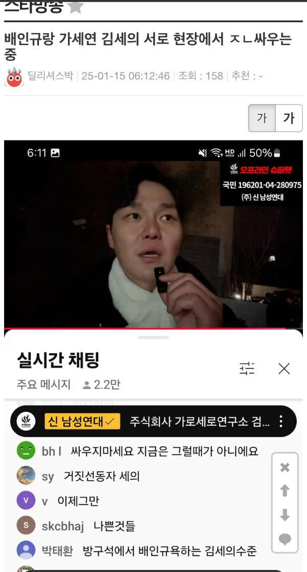 이들이 윤의 체포를 막을 것처럼 이전까지는 마치 장비의 심정과 결계로 방송하지만, 막상 공수처와 경찰이 관저로 올라가니 아무것도 하지 못한다는 걸 알고 꼬리를 내렸다. 새벽에 심지어는 가세연 팬들이 남성연대 방송에 와서 배인규 대표를 욕하기 시작했다. 그러자 배인규는 방송으로 김세의를 욕하기 시작하고 배인규 팬들은 가세연의 유튜브로 가서 싸우기 시작했다. 우파끼리 분열이 일어나기 시작했다. 요즘 가세연의 김세의는 장사의 신과 김건모 아내 허위 보도로 통장압류에 나락으로 떨어지는 와중에서도 방송으로 지금 일억 이천만 원이 필요한데 계좌를 불러주며 여기로 보내라고 대놓고 하는 말에 너무 어이가 없었다. 그런 김세의 모습을 배인규가 욕을 하며 이 새벽에 방구석에 있지 말고 네가 나와서 집회하라고 했다. 싸움의 발단은 김세의가 관저 앞에 나가 있는데 배인규에게 공수처를 몸으로라도 막아야지 뭐 하는 것이냐며 방송했고, 그건 불법이라 바로 현장에서 현행범으로 잡히는 걸 아는 배인규는 김세의에게 분노했다. 윤이 체포되자 자기들끼리 분열하고 폭발하고, 잡히기 전까지 윤이 다시 대통령의 자리로 돌아온다고 믿어서 막말하던 우파 연예인들은 어디에서 뭐 하는지도 모른다. 꼬리를 내리고 감추었다.