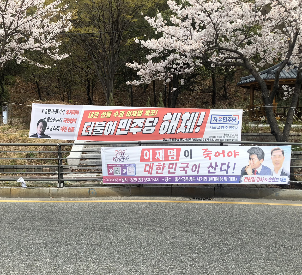 오전에 내가 다니는 길에 전한길이 현수막이 걸려 있는데, 이게 3월 29일 자 현수막이다. 이재명이 죽어야, 같은 글귀가 보란 듯이 들어있고 뒤의 현수막은 나무와 나무 사이에 매달아 놔서 불법이다. 이게 4월이 되어서도 철거가 되지 않아서 파면 전 날, 4월 3일 이 사진을 구청에 민원 신청을 했다. 접수는 되었으나 아직 아무런 답변도 없다. 그래서 지역구 민주당원에게 연락을 하고 조치를 취하겠다는 답변을 들었는데, 오늘까지 철거가 되지 않고 있다. 현수막을 걸어도 꼭 이렇게 누군가 죽어야 같은 글귀를 집어넣어야 하나. 아이들이 보면 참 좋아하겠다.