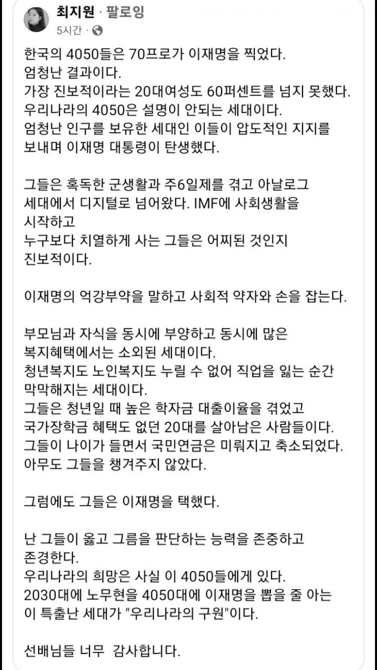 선거가 끝났다. 막상 선거가 끝나고 새로운 세상이 열리면 그동안 SNS에 올렸던 정치풍자 같은 글들을 올리기 전의 시시한 글만 올리고 지내야지 했지만 쉽게 되지 않을 것 같다. 어른이 된 4, 50대는 늘 불안해하며 지낼지도 모른다. 선거가 끝나고 20대 누군가가 SNS에 4, 50대를 향한 글을 올렸다.