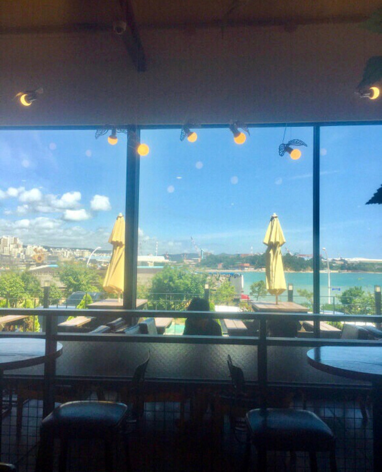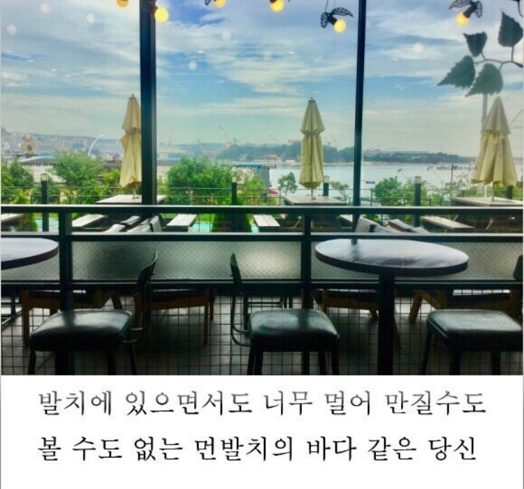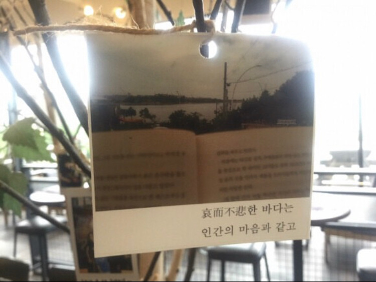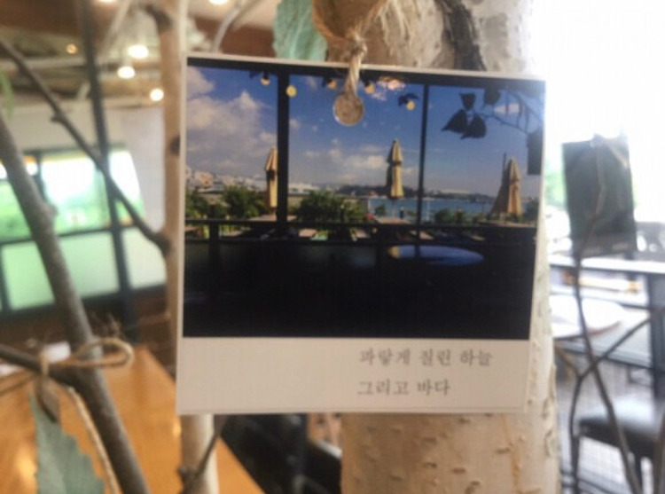 여기는 집 앞 바닷가에 있는 카페다. 한 2년 정도 매일 오전 9시에 들러서 커피를 한 잔 마시고 출근을 했었다. 나는 항상 앉는 자리에 늘 앉고 그 자리에서 보이는 그날그날 풍경을 사진으로 담았다. 그러다가 사진 밑에 짤막한 글을 써서 프린트를 했는데, 카페 주인이 마음에 든다며 화분에 하나씩 걸어두기 시작했는데 양이 꽤 되었다.