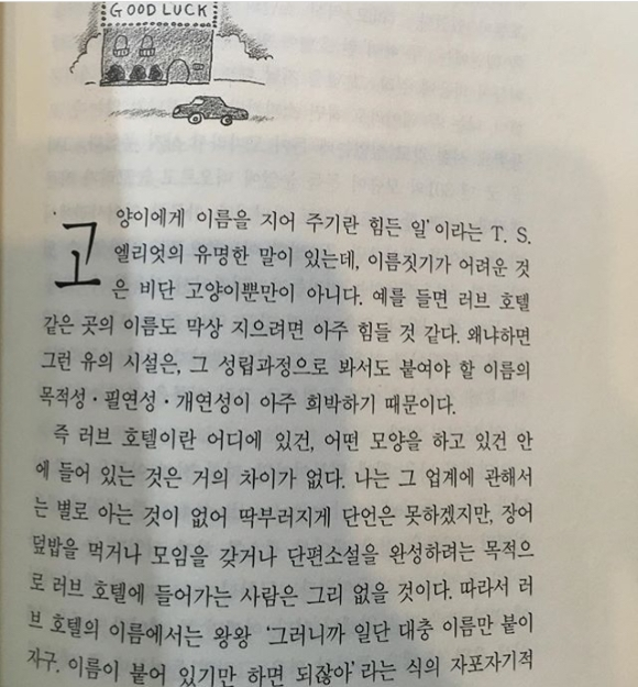고양이에게 이름을 지어주기란 힘든 일, 이라는T.S. 엘리엇의 유명한 말이 있는데,라고 시작하는 이 에세이를 읽으면 역시 재미있다. 일본의 러브 모텔의 이름에 관한 내용인데 무척이나 재미있다. 그래서 우리나라의 모텔 이름도 찾아보니 무릎을 탁 치게 만드는 이름이 많았다. 요컨대 무진장 여관 같은. 이 이야기는 나중에 하기로 하자.