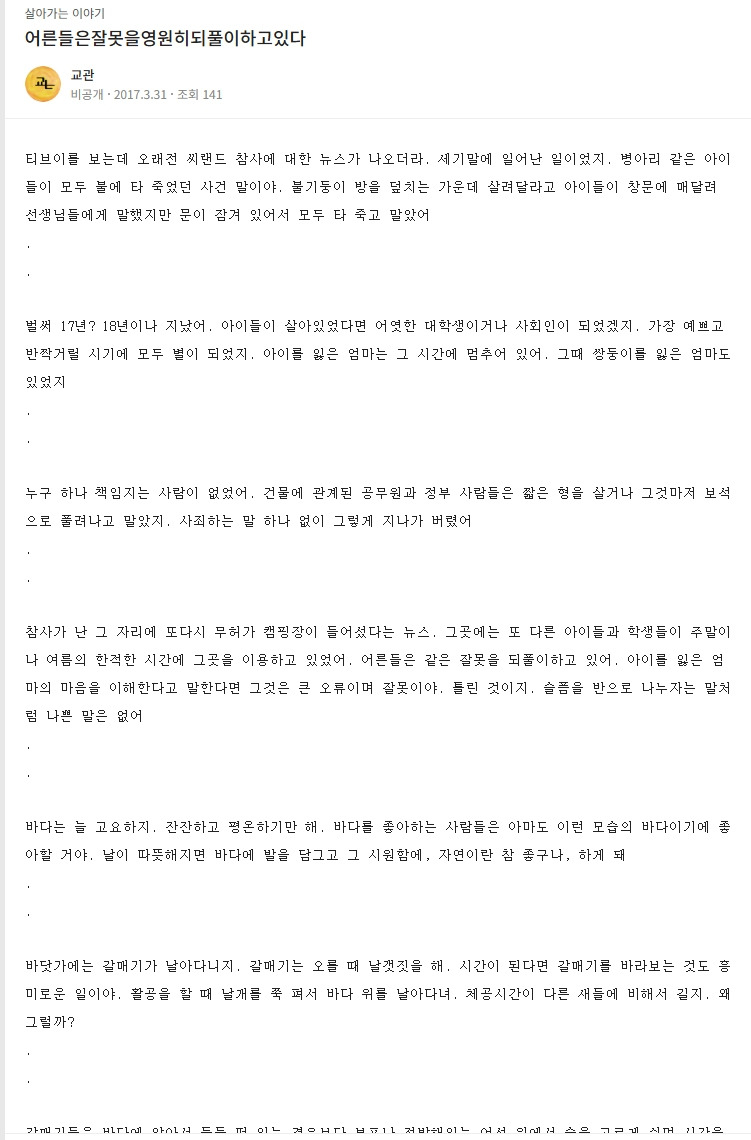 2015년과 2017년에 씨랜드 참사에 대한 글을 썼다. 내가 투철한 정의로운 정신이 있어서 쓴 건 아닌데, 그때 티브이 뉴스에 참사가 난 그 자리에 무허가 캠핑장이 들어섰다는 소식이 나와서 너무 화가 나고 짜증이 났다.