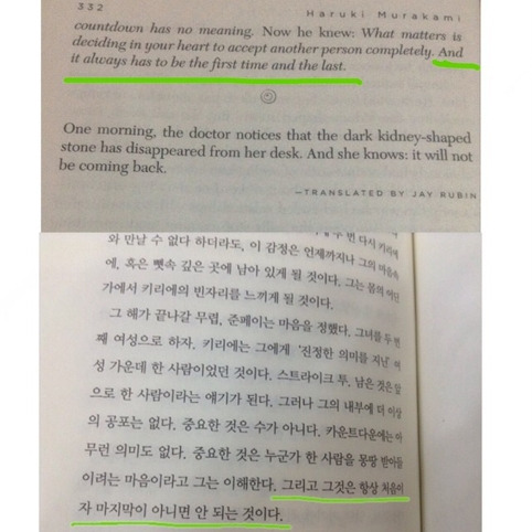 나는 한글밖에 읽지 못하기 때문에 하루키의 한글 번역본만 보지만 영어 번역과 한글 번역을 전부 습득한 친구와 하루키의 이야기나, 하루키의 문학에 대한 이야기를 하는 것은 즐거운 일이다.