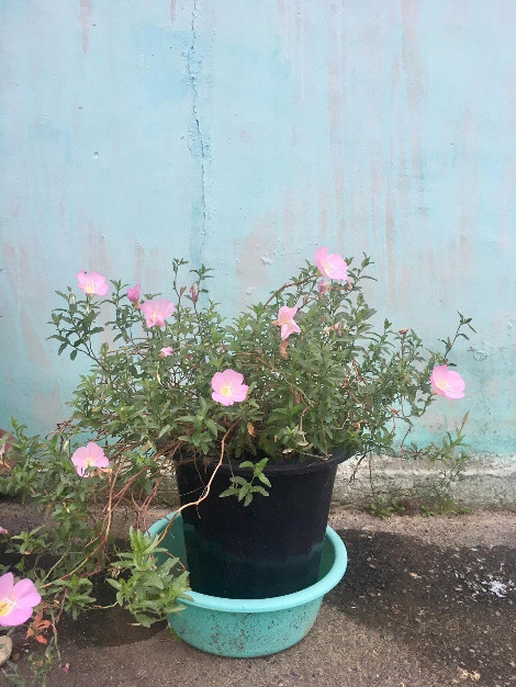 사진이 파스텔로 칠해놓은 그림처럼 보인다. 벽도 촌스러운 페인트를 칠했고, 촌스러운 화분에, 화분 받침대로 촌스러운 대야를 사용했는데 그런 것들이 모여 한 폭의 그림이 되었다.