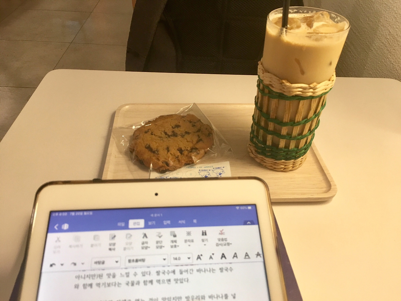 보통 한 시간 정도 글을 쓰다가 집으로 들어간다. 운동을 하고 난 직후라 나의 모습은 대역죄인 같은 모습인데 이곳에 들어오면 모든 것에서 차단이 되고 편안함으로 무장이 된다. 시원한 라테를 한 잔 마시고 내가 쓰고 싶은 글을 한 시간 정도 열심히 적을 수 있다. 이 날은 쿠키를 얻어먹었다. 쿠키가 손바닥만 한 게 크고 두툼하고 역시 맛있다.