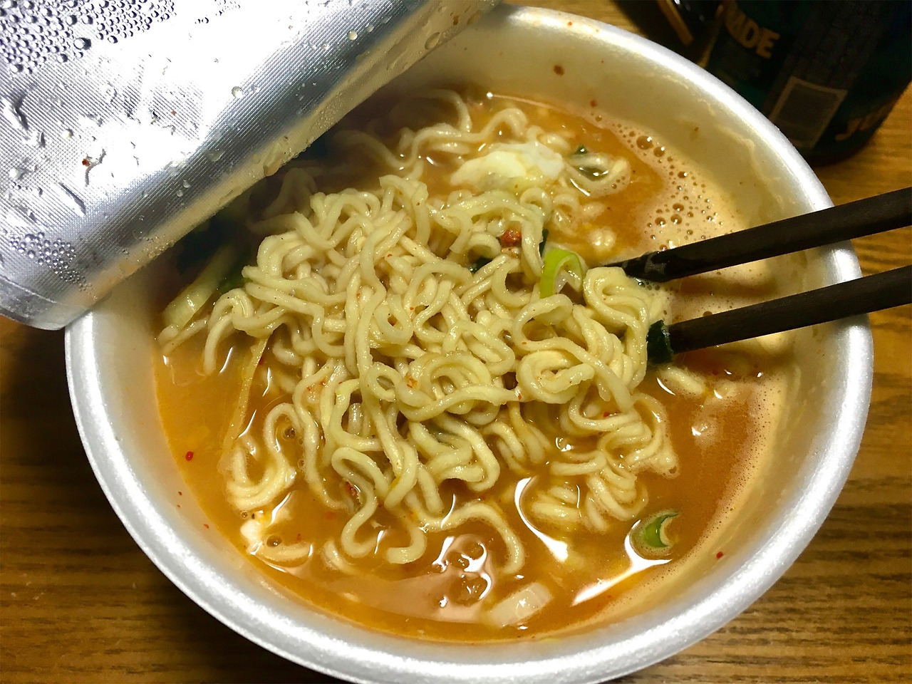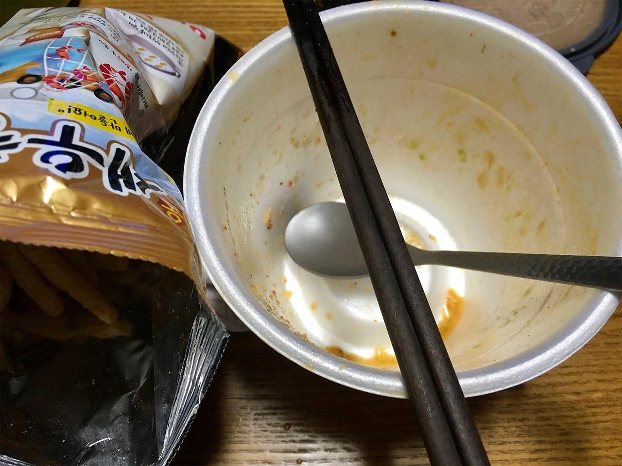 새우탕면이 다 익으면 계란이 풀어져 고소한 데다 고춧가루 때문에 매콤한 맛이 어우러질 때 국물에서는 새우의 풍미가 확 풍긴다. 국물을 버릴 수가 없다. 국물을 버리는 건 죄악이다. 밥이 있다면 말아먹으면 더 맛있다. 그리고 반 정도 남은 새우깡은 냠냠 거리며 아작아작 씹어 먹으면 된다.