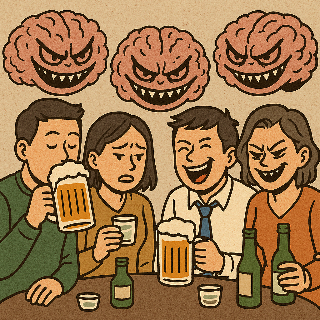 여기에 술의 “시원함”과 “톡 쏘는 맛”이 더해진다. 많은 술이 차갑게, 혹은 탄산과 함께 제공되는 이유도 여기에 있다. 그것은 감각적 요소를 이용해 술을 쾌락처럼 느끼도록 뇌를 속인다. 사람들은 그 기분 좋은 착각을 위해 술을 찾고, 반복하며, 결국 중독으로 내몰린다.