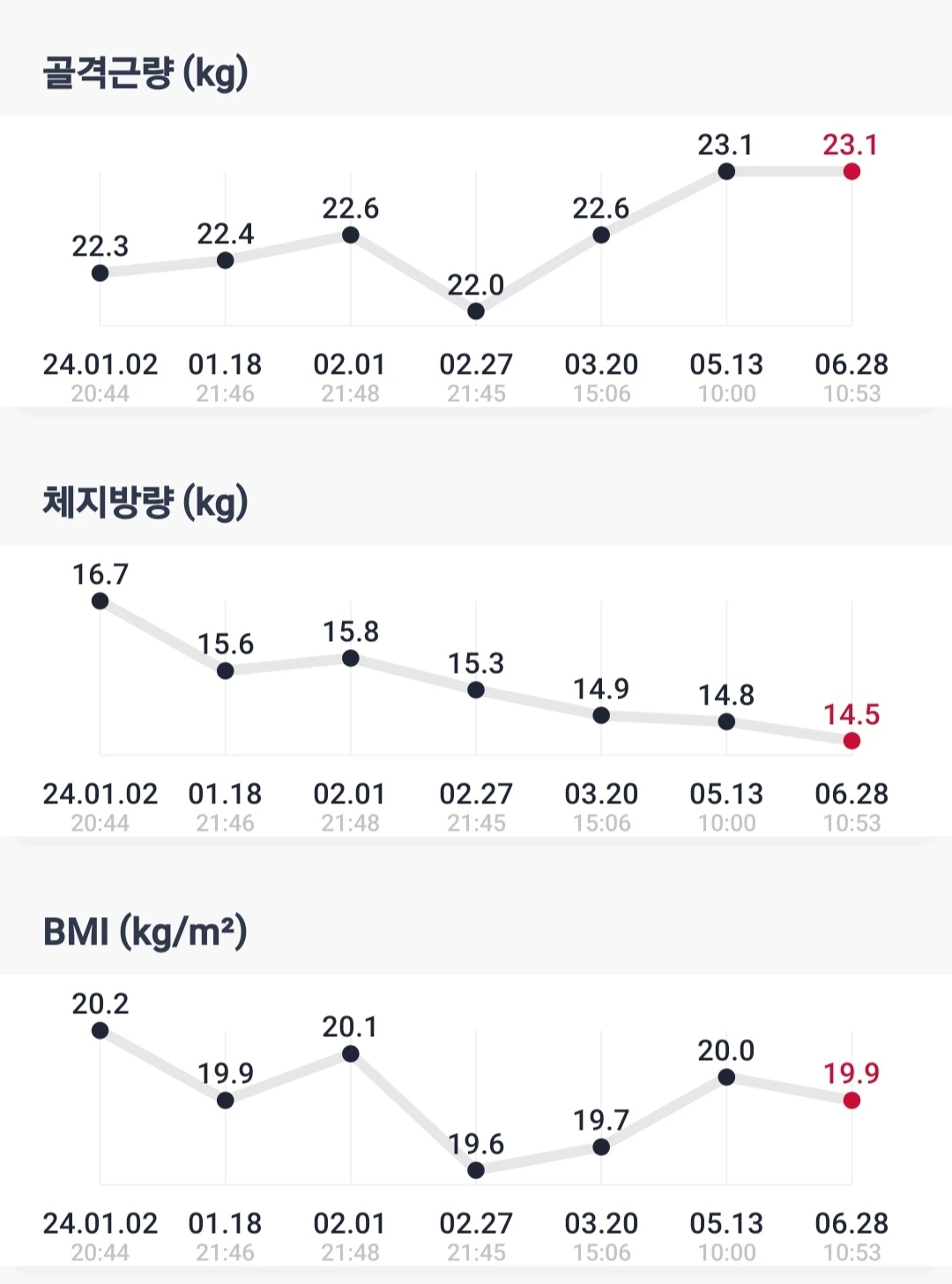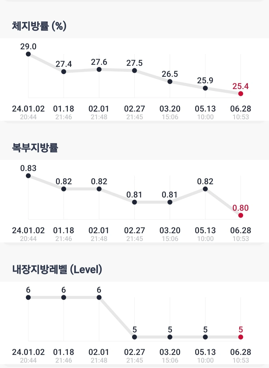 노화의 주범인 스트레스 관리는 힘들지만, 인바디 관리라도 주기적으로 하는데 마침 생각난 김에 6월 말을 기점으로 반년치 점검을 해봤다.