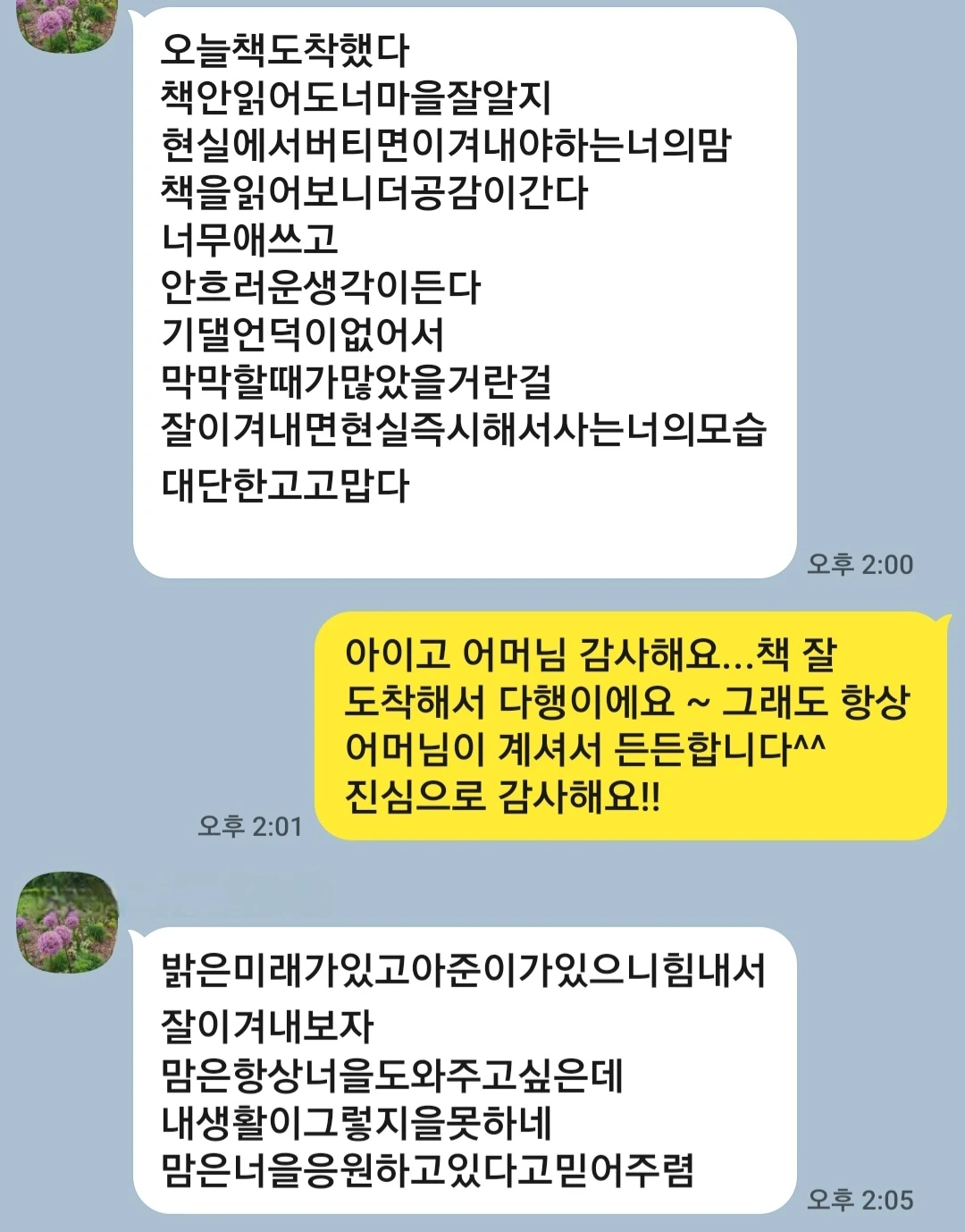 "오늘 책 도착했다. 네 마음 잘 알지. 현실에서 버티고 이겨내야 하는 네맘 책을 읽어보니 더 공감 간다. 너무 애쓰고 안쓰러운 생각이 든다. 기댈 언덕이 없어서 막막할 때가 많았을 거란걸.. 잘 이겨내며 현실 직시해서 사는 너의 모습 고맙고 대단하다"