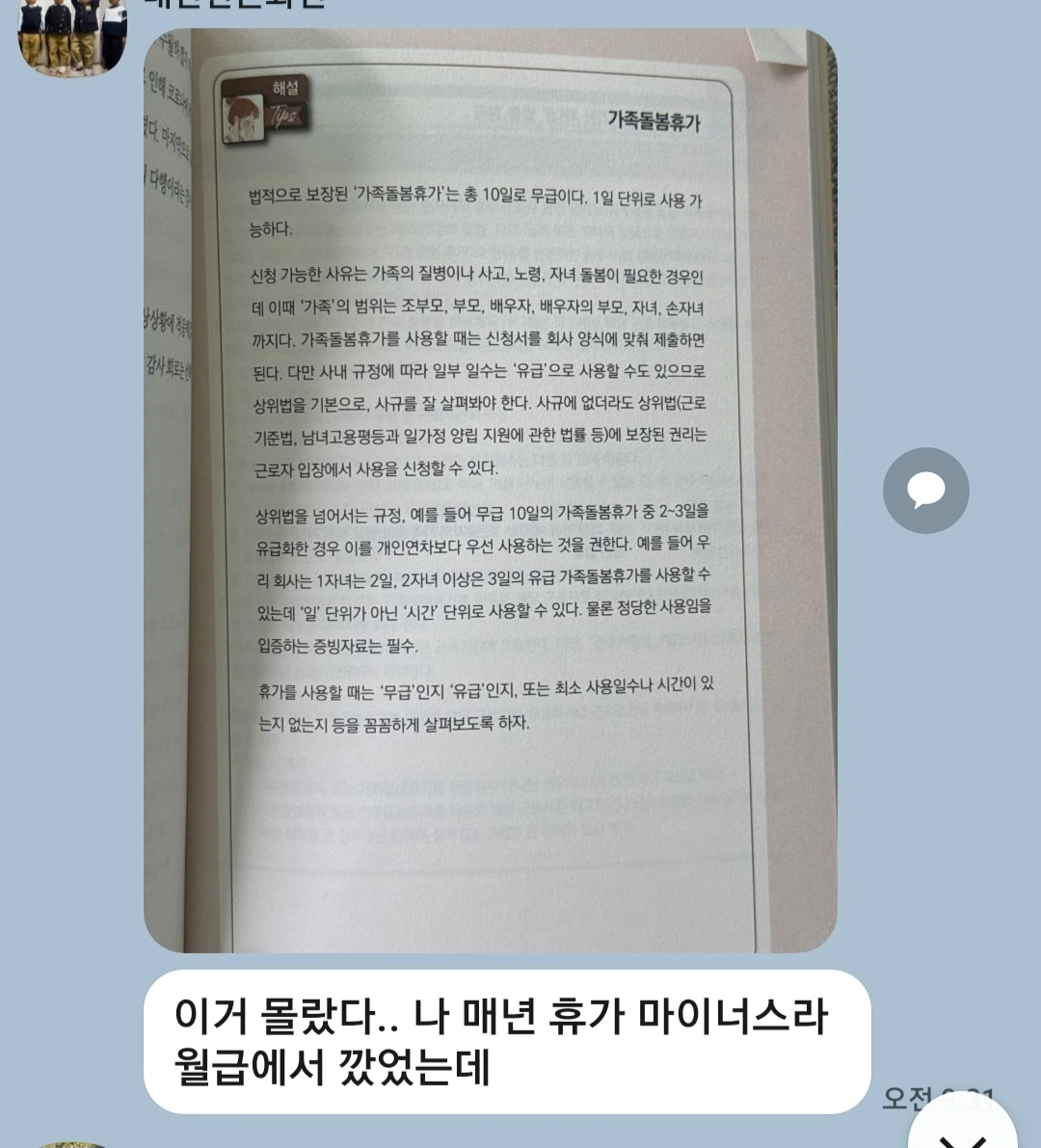 “가족돌봄휴가라는 게 있는 줄 네 책 보고 처음 알았어. 난 그것도 모르고 월급에서 까서 휴가 쓰고 있었는데.. 일하는 엄마들은 늘 휴가가 부족하잖아... 암튼, 나도 회사에 말해봐야겠다. 고마워!”