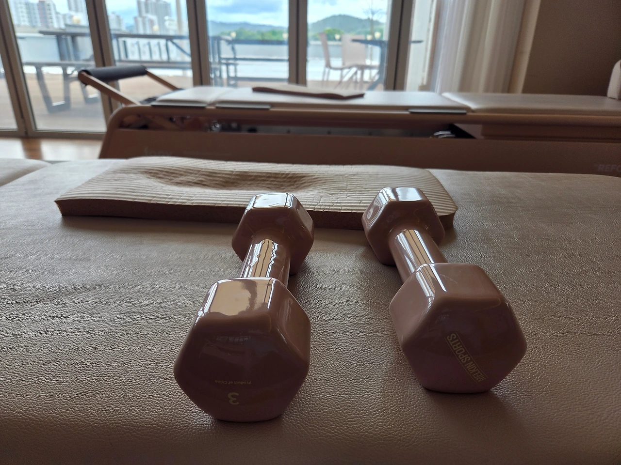 핑크빛 어여쁜 아령 두 개가 다소곳이 리포머 위에 놓여있었다.