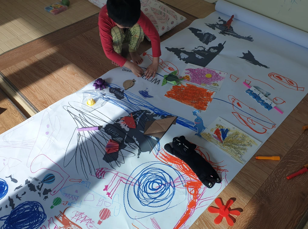 집에 박혀 있던 스티커들 다 꺼내 주고 마음껏 꾸미라고 했더니 멋진 바다와 공룡이 살던 육지가 탄생했다.