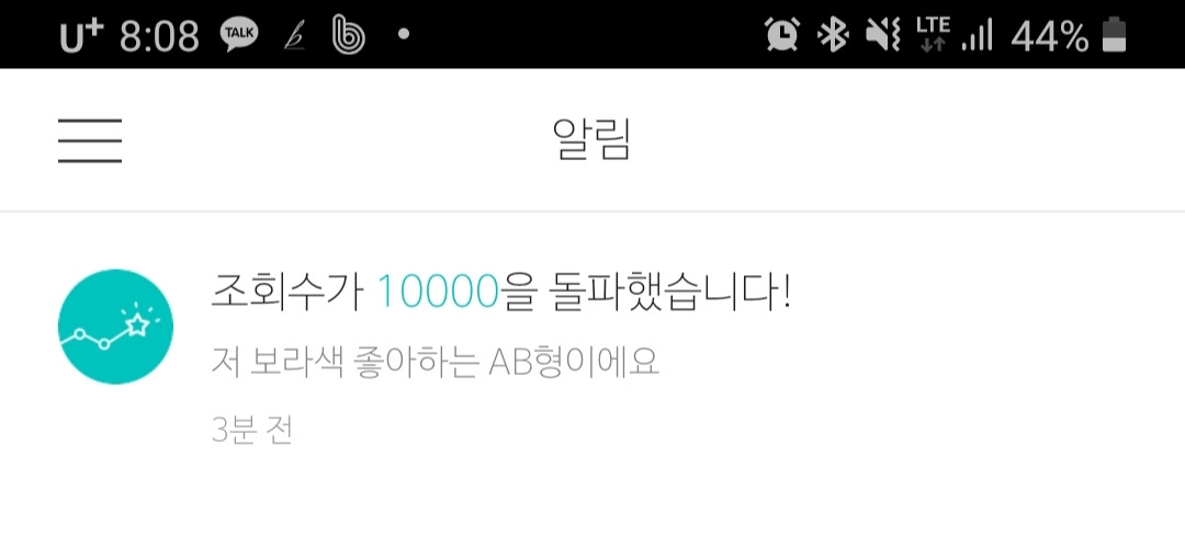 바로 이전 글, '저 보라색을 좋아하는 AB형이에요'가 다음 메인에 노출되면서 만뷰가 넘었다.