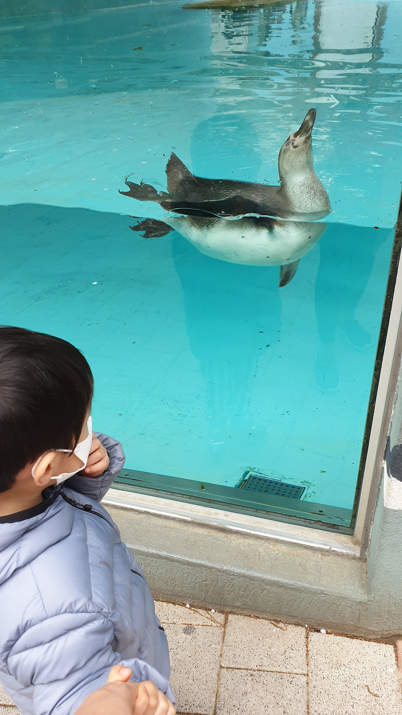 펭귄을 한번 더 보고 가려고 했는데 2시경, 비가 쏟아지고 있어 서둘러 길을 나섰다. 때마침 3층 식당에서 엘리베이터를 타고 1층에 가니 기념품샵에서 우비를 팔아서, 아이들도 어른들도 비 맞지 않고, 노란색 우비 입고 사진 찍는 추억을 만들면서 집으로 돌아왔다.