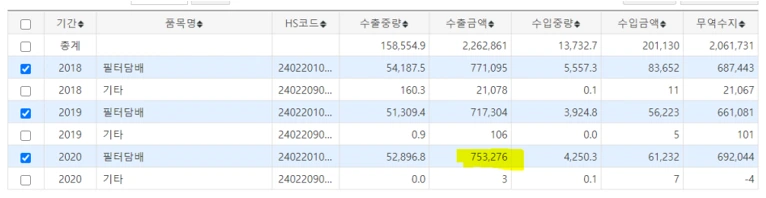 관세청에서 필터 담배의 HS코드를 입력하여 24022010에 해당하는 수출금액을 확인합니다. 넉넉하게 2018년부터 살펴보면 아래와 같은 수출금액을 확인할 수 있습니다: