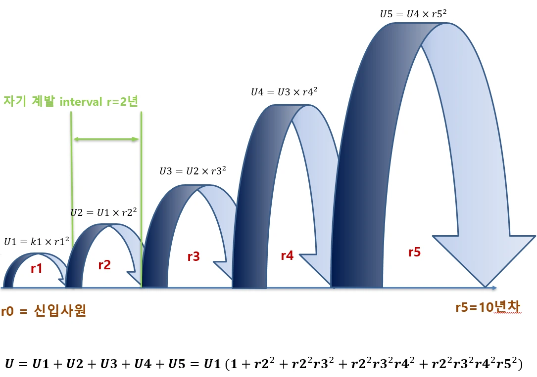 신입사원 A의 경우 2년간의 목표 설정 및 이에 대한 자기 투자를 통해 그 에너지를 축적시키고, 동일한 직무 기간 10년 동안 총 1364k 1에 해당하는 에너지를 쌓았다. k1이 기하급수적(interval 2년의 제곱, 즉 4의 배수)로 증가하는 것이 눈에 보인다.