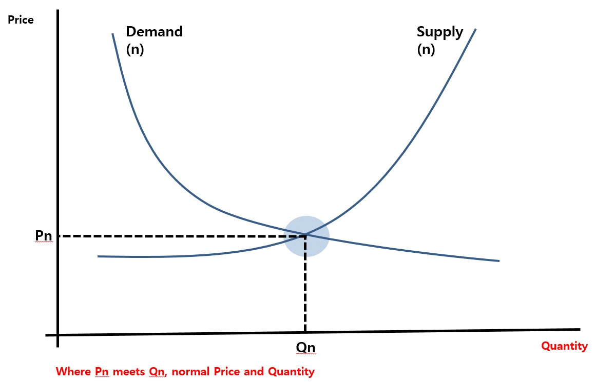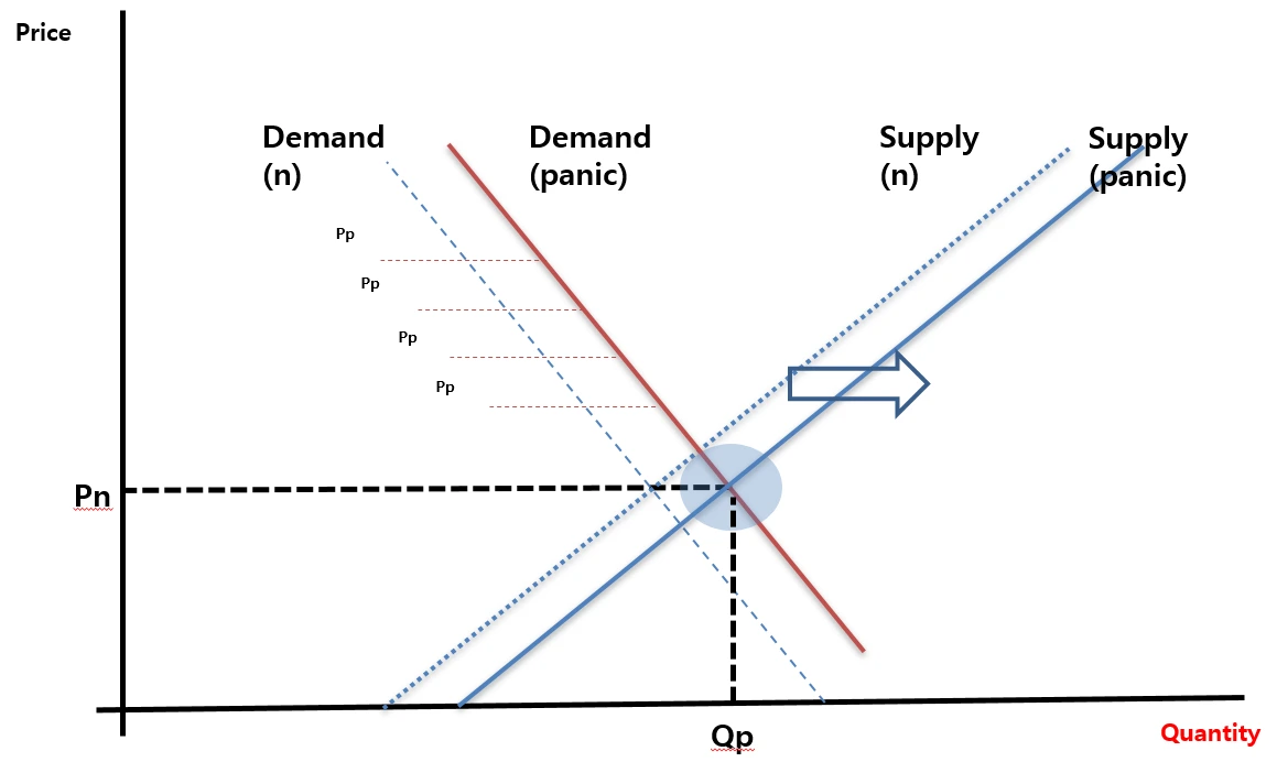 그러나 단지 일시적으로 정상 공급 (Qn)이 수요를 따라잡지 못하는 사재기의 이상 간극이 발생함에 따라 시장 경제 체제 system에 무리가 간다고 볼 수 있을까? 상기와 같은 단기적 공급도 결국은 일회성일 뿐이다. 시세 차익을 챙기는 단기 공급자들의 웃음을 뒤로 한채, 결국 이 붉은 간극은 시간이 해결해 준다. 시간이라 함은 결국 정부의 입김이 어느 정도는 들어가야 한다는 것이다.