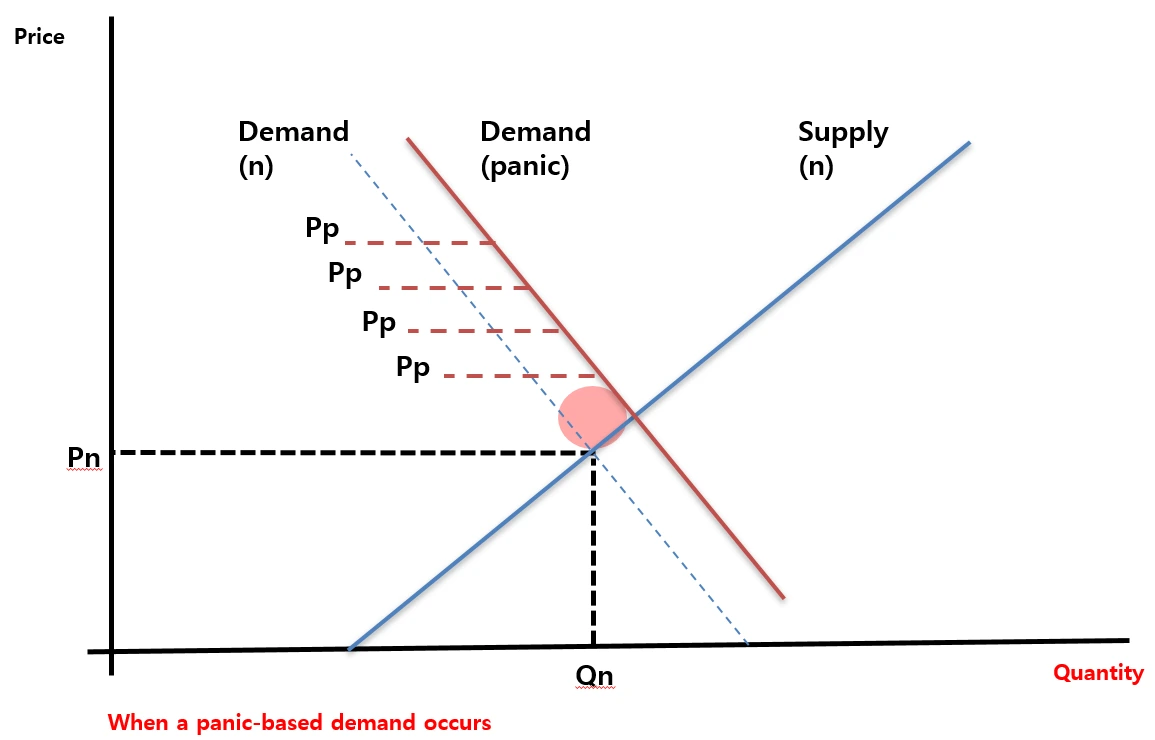 이러한 단기적 수요 폭증은 당연히 단기적 공급 부재를 낳는다. 오늘 화장지를 못 샀으면, 내일도 못 살 확률이 높다. 그러나 단기간 (10일 이내로) 기존에 형성된 시장 균형 가격 (Pn)에도 크게 변동은 없다. 그러나 계란 한 판을 사기 위해 직접 양계장으로 발로 (계란 1판 가격+ 노동력+ 기름값을 들여) 뛰어다녀 구하지 않는 이상 소비자는 넘치는 수요를 가격 (시장가 Market Price)로 만들지 못한다. 시장에 돈은 있지만 공급이 부재하기 때문이다. 이 상황에서는 결과적으로 시장에 단기적 단발성 공급들이 나타나기 마련이다.