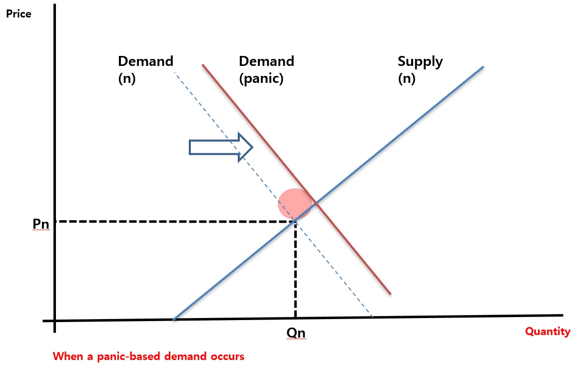 반면, 사재기가 장기화된다고 가정하면 하기와 같이 수요 곡선이 오른쪽으로 이동함에 따라 결과적으로 공급과 가격은 함께 올라가야 한다. 시장 참여자들이 넘치는 수요를 감안하면, 결과적으로 경쟁체제에 들어설 것이고, 대규모 유통업계에서도 공급물량과 수요 사이를 저울질하며, 어느 정도 이익을 추구할 수밖에 없다.