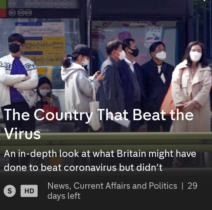 SARS와 MERS를 겪은 한국의 코로나 19에 대처하는 자세는 단연코 본받을 만한 것이며, 많은 나라들이 이를 알고 있다. 영국 BBC에서는 한국의 노고를 치하하며, 하기의 다큐멘터리를 제작한다. '영국인 주의' 이 영상은 위대한 영국이 아닌, 극동지방의 작은 나라에서 벌어진 일입니다. 제목: 그 바이러스를 무찌른 그 나라, 영국이 코로나를 무찌르기 위해 했어야만 했던 것들에 대한 심층 분석.