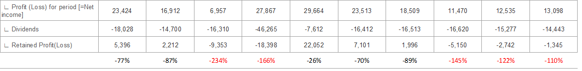 요약하면: 이 기업은 주주의 행복을 최우선으로 합니다. 순이익에서 배당금을 지급하는 비율, 배당 성향이 평균 70%이며, 때로는 순이익보다 많은 금액을 억지 배당하는 정책을 펼쳤습니다. 아래 표 참조하시기 바랍니다.